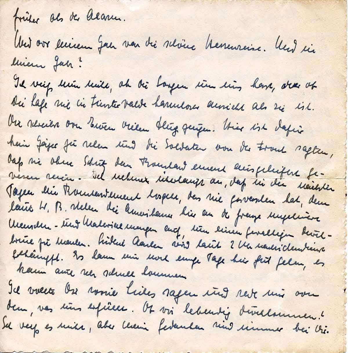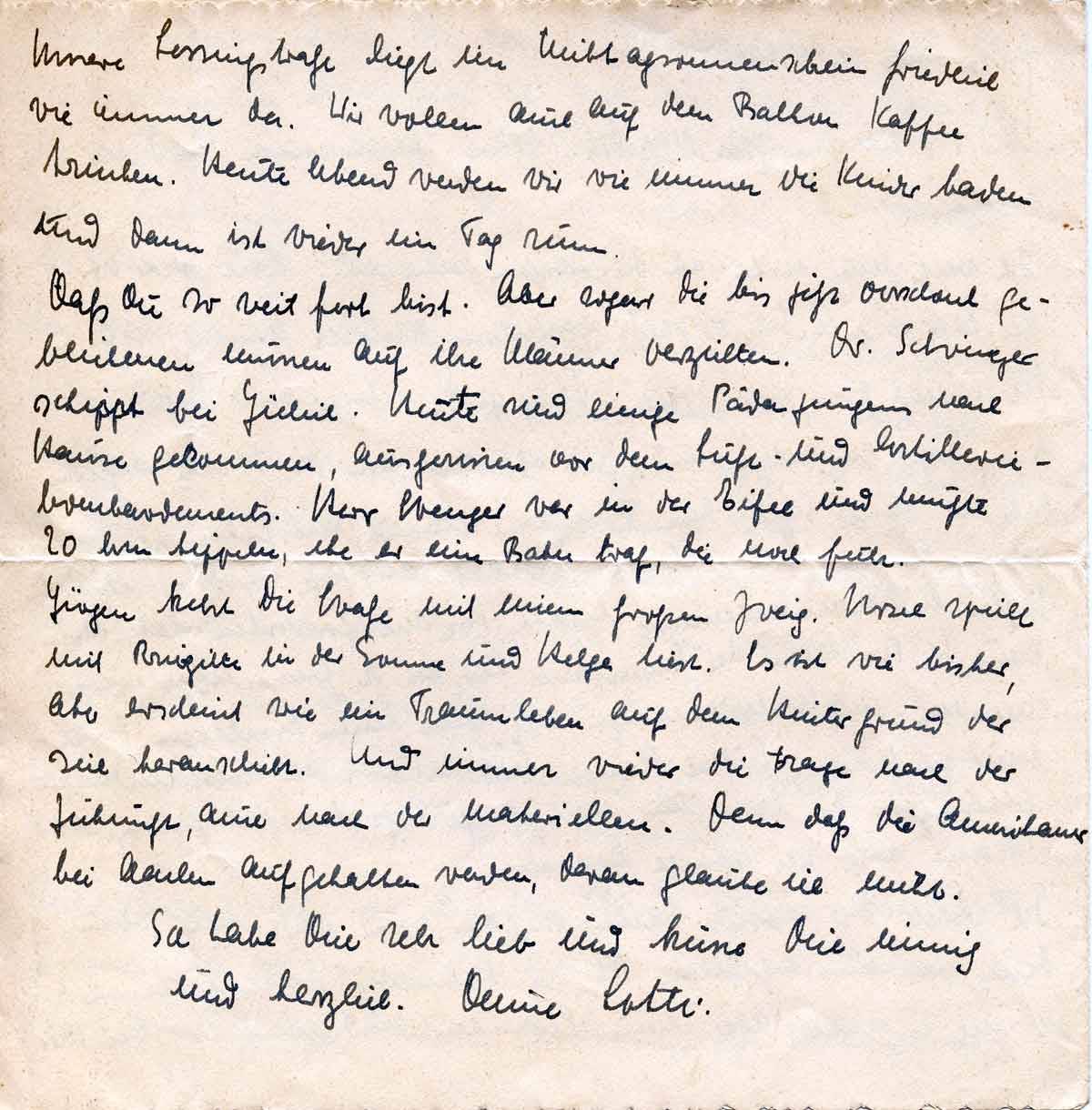 Ich gebe diesen Brief Fräulein Mallasch aus Bremen mit, die ihn dort in den Kasten wirft. Wer weiß, ob Du meine nächsten Briefe noch bekommst, denn an ein Aufhalten der Amerikaner am Westwall glaube ich nicht. Unsere Nerven sind bis zum Zerreißen gespannt über unser ungewisses Schicksal. Bei einem Soldaten, der in die Schlacht geht, fällt wenigstens die Verantwortung weg, die für ihn die Führung hat. Aber wir trauern mit den Kindern. Da ist das Haus, die ungewisse Zukunft, und keiner weiß, woran man recht tut. Ich denke viel an Dich, und das und unsere schönen Erinnerungen sind mir ein Trost. Die Kinder, so lieb ich sie habe, sind augenblicklich kaum zu ertragen, sie haben von unserer Not keine Ahnung und schießen andererseits ins Kraut. Aber es ist in allen Familien so.