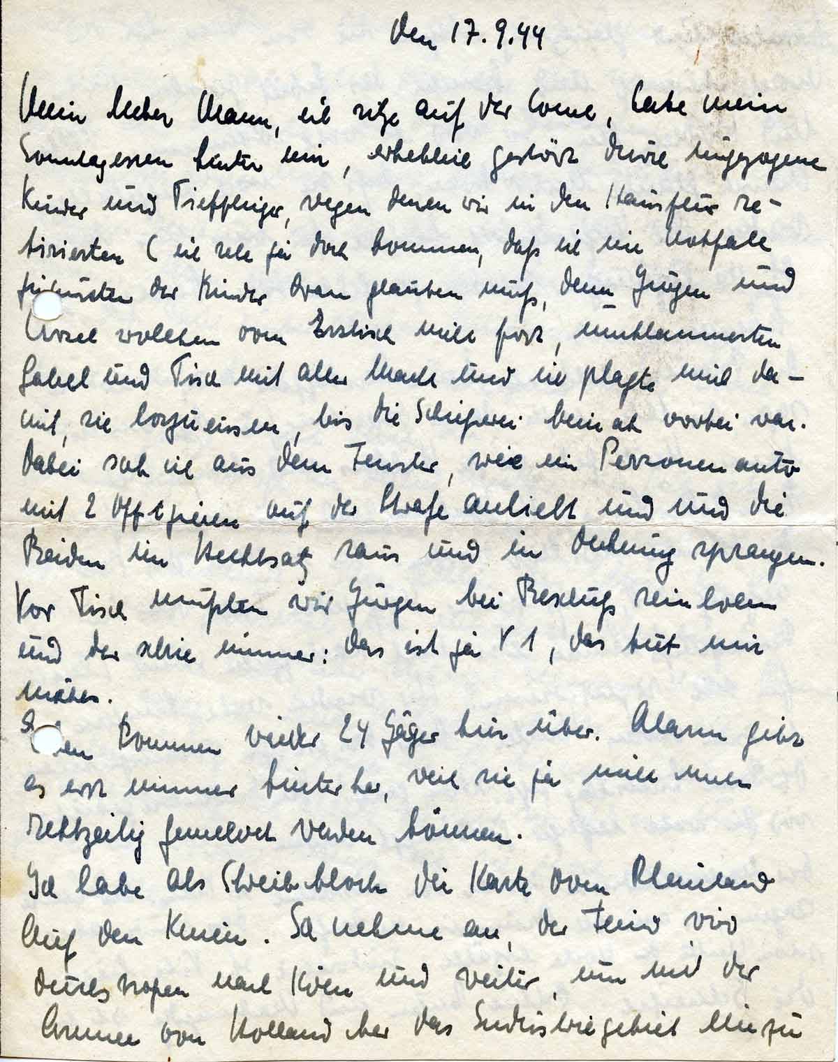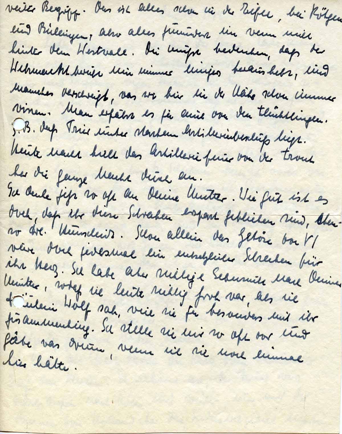 Ich denke jetzt oft an Deine Mutter. Wie gut ist es doch, dass ihr diese Schrecken erspart geblieben sind, ebenso wie Fräulein Hunscheidt. Schon allein das Getöse der V 1 wäre doch jedes Mal ein entsetzlicher Schrecken für ihr Herz. Ich habe aber richtige Sehnsucht nach Deiner Mutter, so dass ich heute richtig froh war, als ich Fräulein Wolf sah, weil sie besonders mit ihr zusammenhing. Ich stelle sie mir so oft vor und gäbe was drum, wenn ich sie noch einmal hier hätte.