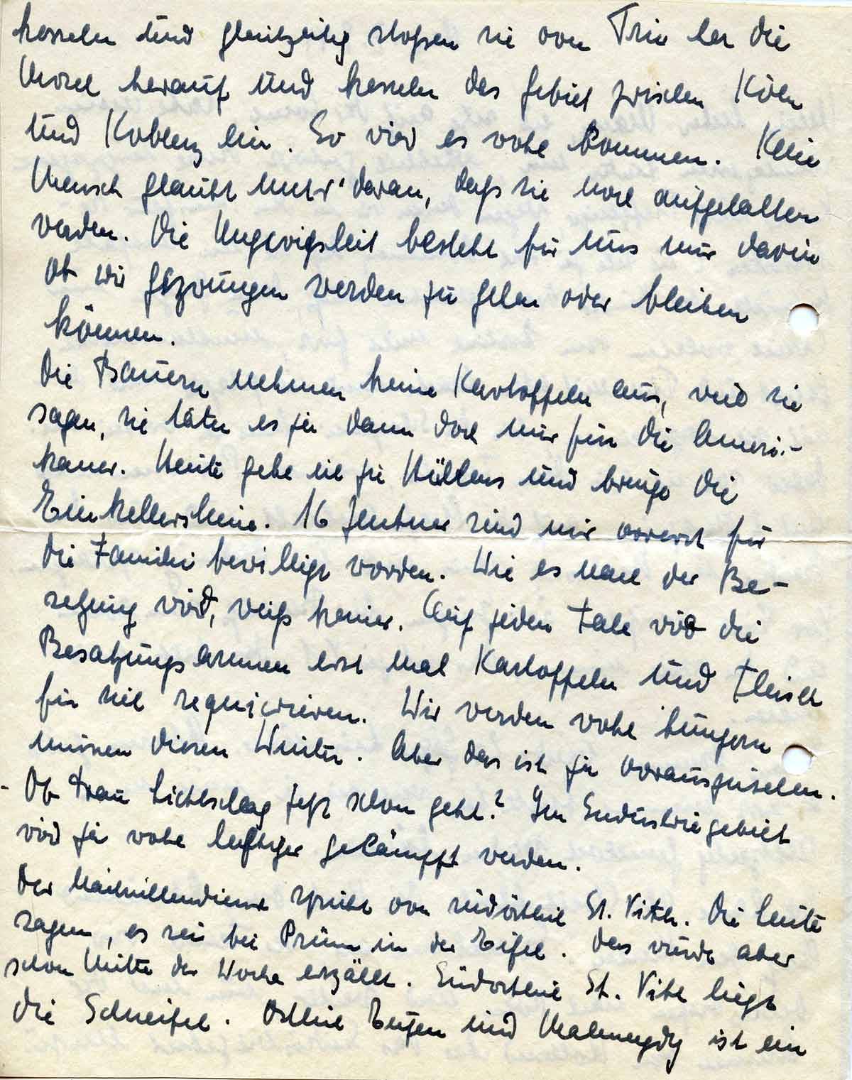 Die Bauern nehmen keine Kartoffeln aus, weil sie sagen, sie täten es ja doch nur für die Amerikaner. Heute gehe ich zu Hüllens und bringe die Einkellerscheine. 16 Zentner sind mir vorerst für die Familie bewilligt worden. Wie es nach der Besetzung wird, weiß keiner. Auf jeden Fall wird die Besatzungsarmee erst mal Fleisch und Kartoffeln für sich requirieren. Wir werden wohl hungern müssen diesen Winter. Aber das ist ja vorauszusehen. Ob Frau Lichtschlag jetzt schon geht? Im Industriegebiet wird ja wohl heftiger gekämpft werden.