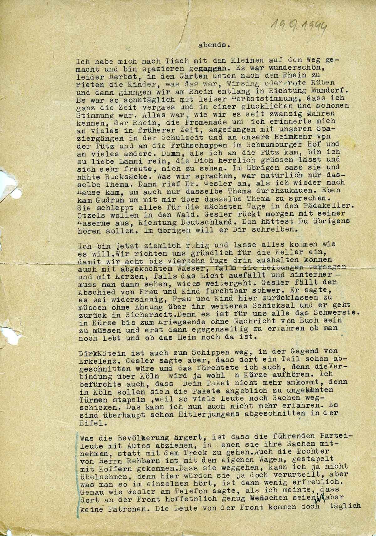 Ich habe mich nach Tisch mit den Kleinen auf den Weg gemacht und bin spazieren gegangen. Es war wunderschön, leider Herbst, in den Gärten unten nach dem Rhein zu rieten die Kinder, was das war, Wirsing oder rote Rüben, und dann gingen wir am Rhein entlang in Richtung Mondorf. Es war so sonntäglich, mit leiser Herbststimmung, dass ich die Zeit ganz vergaß und in einer glücklichen und schönen Stimmung war. Alles war, wie wir es seit zwanzig Jahren kennen, der Rhein, die Promenade, und ich erinnerte mich an vieles in früherer Zeit, angefangen mit unseren Spaziergängen in der Schulzeit und an unsere Heimkehr von der Pütz und an die Frühschoppen im Schaumburger Hof und an vieles andere. Dann, als ich an die Pütz kam, bin ich zu Liebe Lenni rein, die Dich herzlich grüßen lässt und sich sehr freute, mich zu sehen. Im übrigen saß sie und nähte Rucksäcke. Was wir sprachen, war natürlich nur dasselbe.