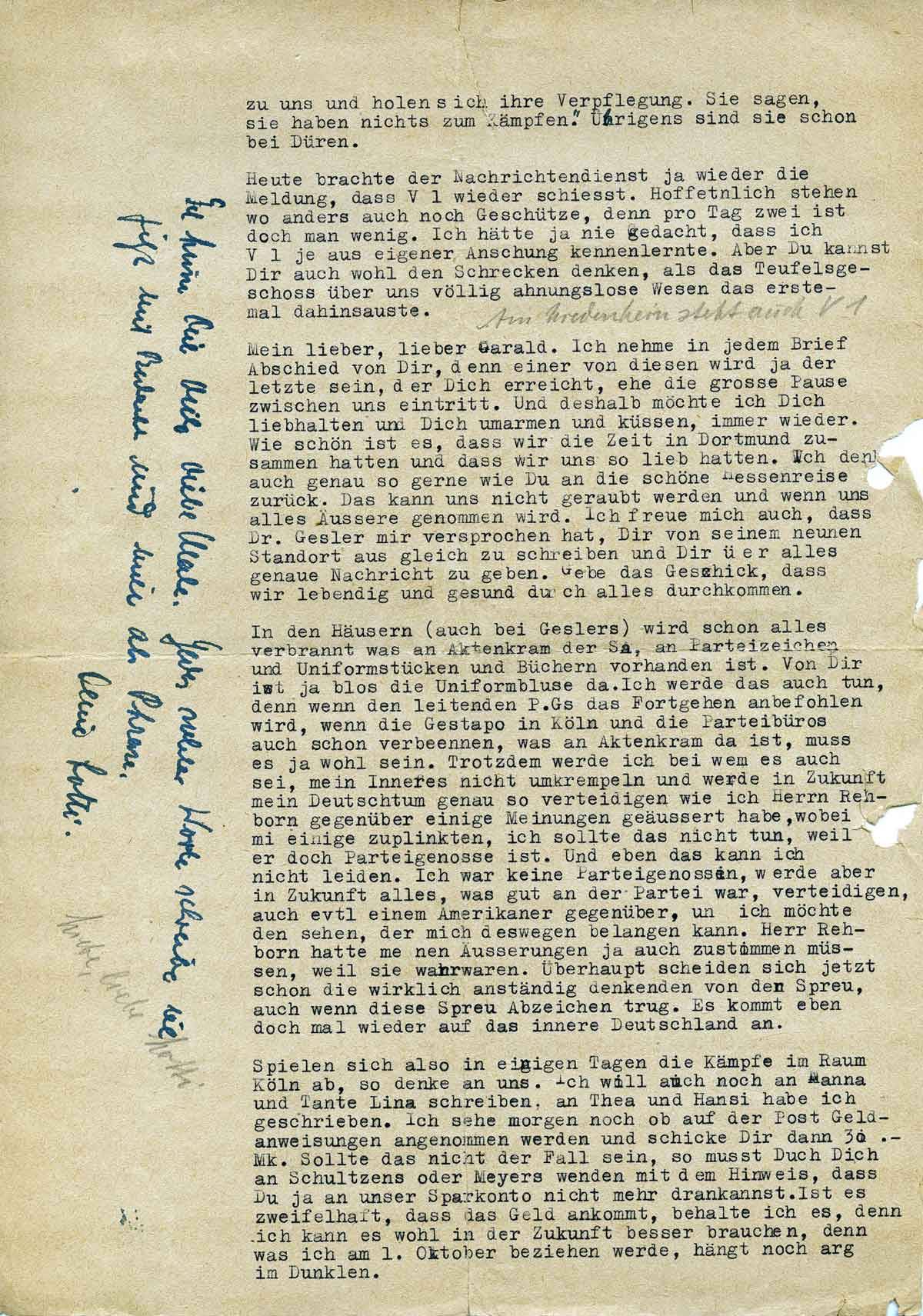 In den Häusern (auch bei Geslers) wird schon alles verbrannt, was an Aktenkram der SA, an Parteizeichen und Uniformstücken und Büchern vorhanden ist. Von Dir ist ja bloß die Uniformbluse der HJ-Kapelle da. Ich werde sie auch verbrennen, denn wenn den leitenden PG.s das Fortgehen anbefohlen wird, wenn die Gestapo in Köln und die Parteibüros auch schon verbrennen, was an Aktenkram da ist, muss es ja wohl sein. Trotzdem werde ich, bei wem es auch sein möge, mein Inneres nicht umkrempeln und werde in Zukunft mein Deutschtum genau so verteidigen, wie ich Herrn Rehborn gegenüber einige Meinungen geäußert habe, wobei mir einige zuplinkten, ich solle das nicht tun, weil er doch Parteigenosse ist. Und eben das kann ich nicht leiden. Ich war keine Parteigenossin, werde aber in Zukunft alles, was gut an der Partei war, verteidigen, auch einem Amerikaner gegenüber, und ich möchte den sehen, der mich deswegen belangen kann. Herr Rehborn hatte meinen Äusserungen übrigens zustimmen müssen, weil sie wahr waren. Überhaupt scheiden sich jetzt, schon die wirklich anständig Denkenden von der Spreu, auch wenn diese Spreu Abzeichen trug. Es kommt eben doch mal wieder auf das innere Deutschland an.