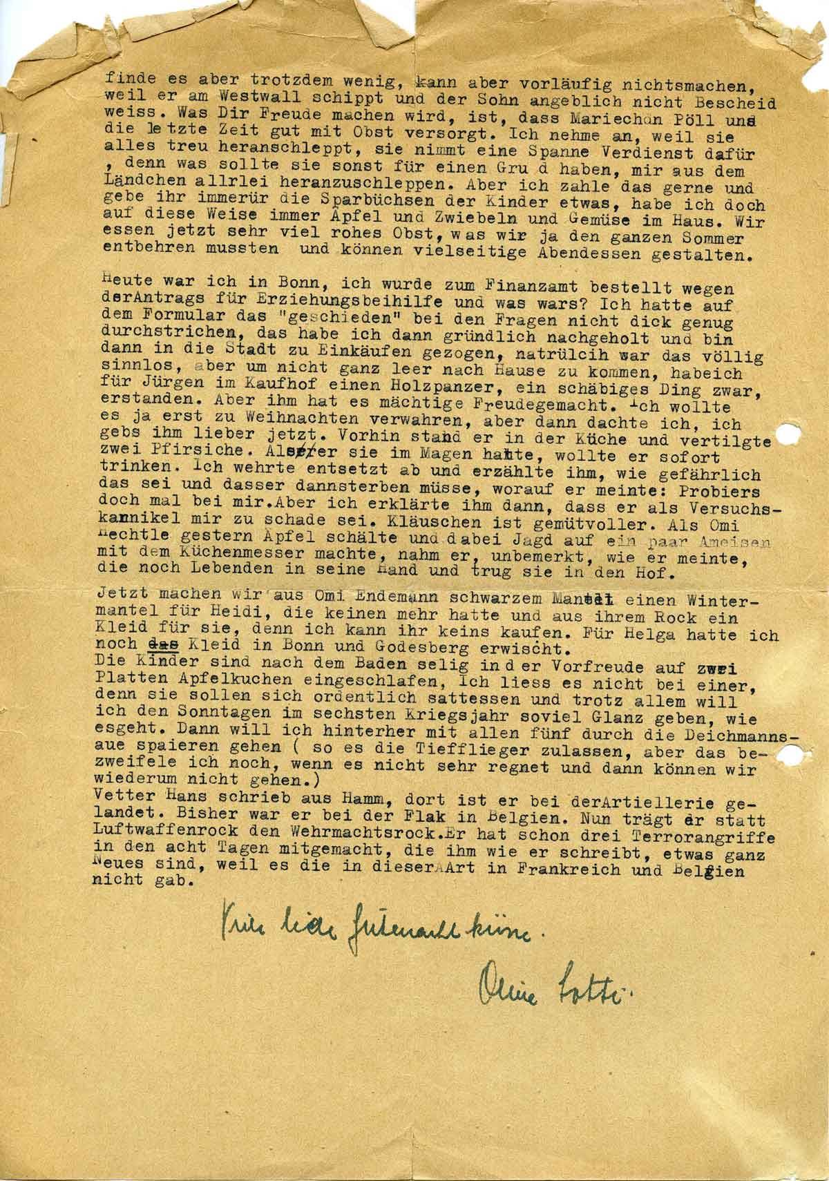 Vetter Hans schrieb aus Hamm. Dort ist er bei der Artillerie gelandet. Bisher war er bei der Flak in Belgien. Nun trägt er statt Luftwaffenrock den Wehrmachtsrock. Er hat schon drei Terrorangriffe in den acht Tagen mitgemacht, die ihm, wie er schreibt, etwas ganz Neues sind, weil es die in dieser Art in Frankreich und Belgien nicht gegeben hat.