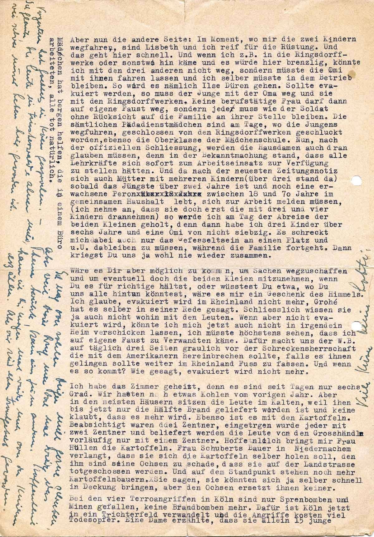 Wäre es Dir aber möglich zu kommen, um Sachen wegzuschaffen und um eventuell doch die beiden Kleinen mitzunehmen, wenn Du es für richtig hältst, wäre es mir ein Geschenk des Himmels. Ich glaube, evakuiert wird im Rheinland nicht mehr. Grohe hat es selber in seiner Rede gesagt. Schließlich wissen sie ja auch nicht wohin mit den Leuten. Wenn aber nicht evakuiert wird, könnte ich mich jetzt auch nicht in irgendein Heim verschicken lassen, ich müsste höchstens sehen, dass ich auf eigene Faust zu Verwandten käme.