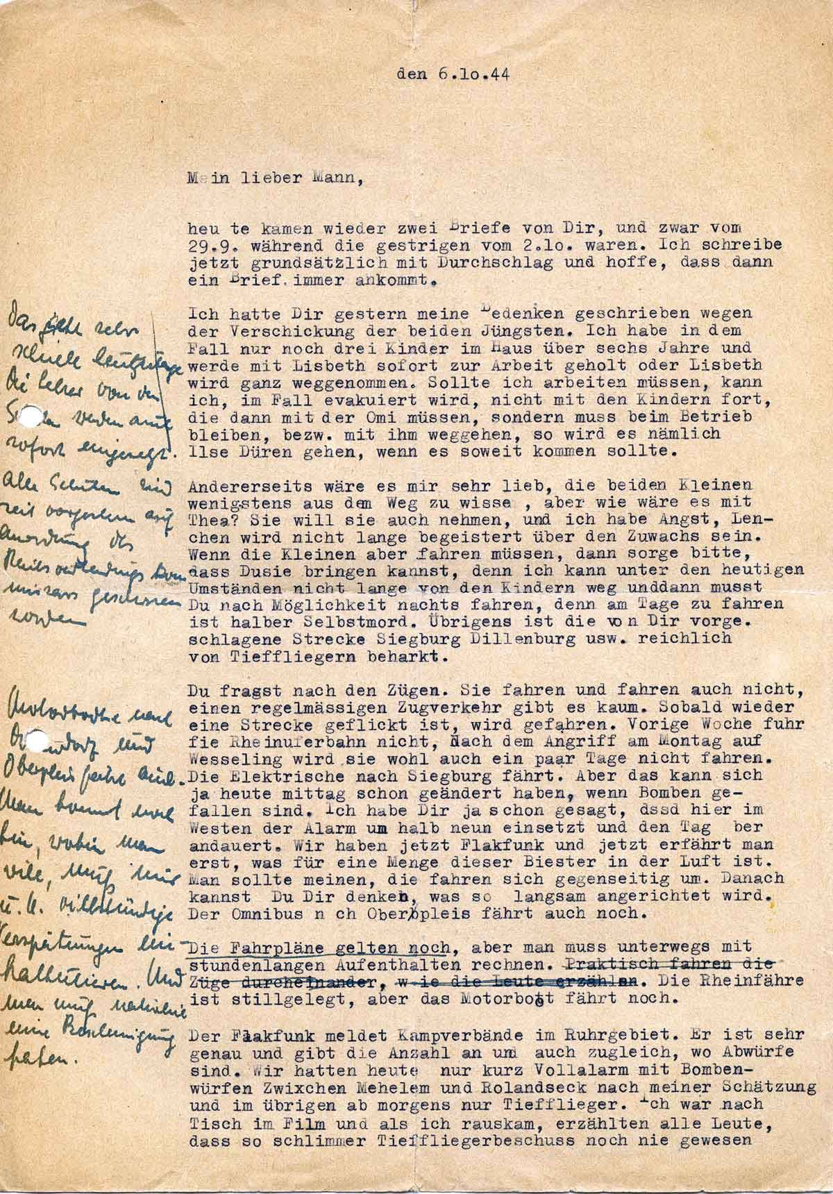 Andererseits wäre es mir lieber, die beiden Kleinen wenigstens aus dem Weg zu wissen, aber wie wäre es mit Thea? Sie will sie auch nehmen, und ich habe Angst, Lenchen wird nicht lange begeistert über den Zuwachs sein. Wenn die Kleinen aber fahren müssen, dann sorge bitte, dass Du sie bringen kannst, denn ich kann unter den heutigen Umständen nicht lange von den Kindern weg und dann musst Du nach Möglichkeit nachts fahren, denn am Tage zu fahren ist halber Selbstmord. Übrigens ist die von Dir vorgeschlagene Strecke Siegburg Dillenburg usw. reichlich von Tieffliegern beharkt.
