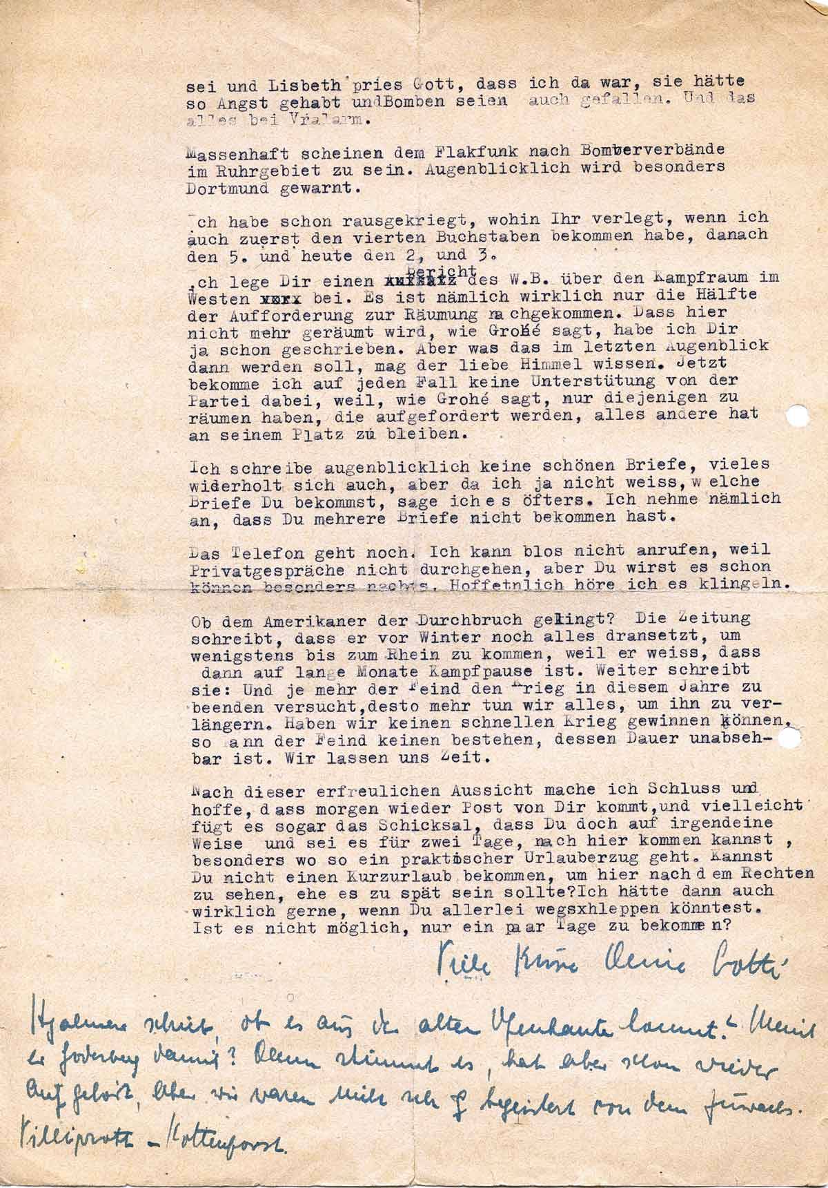 Ich lege Dir einen Bericht des W.B. über den Kampfraum im Westen bei. Es ist nämlich wirklich nur die Hälfte der Aufforderung zur Räumung nachgekommen. Dass hier nicht mehr geräumt wird, wie Grohé sagt, habe ich Dir ja schon geschrieben. Aber was das im letzten Augenblick dann werden soll, mag der liebe Himmel wissen. Jetzt bekomme ich auf jeden Fall keine Unterstützung von der Partei dabei, weil, wie Grohé sagt, nur diejenigen zu räumen haben, die aufgefordert werden, alles andere hat an seinem Platz zu bleiben.