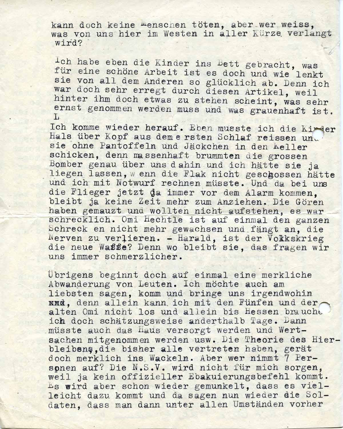 Ich komme eben wieder herauf. Eben musste ich die Kinder Hals über Kopf aus dem ersten Schlaf reißen und sie ohne Pantoffeln und Jäckchen in den Keller schicken, denn massenhaft brummten die großen Bomber über uns dahin, und ich hätte sie ja liegen lassen, wenn die Flak nicht geschossen hätte und ich mit einem Notwurf rechnen müsste. Die Gören haben gemauzt und wollten nicht aufstehen, es war schrecklich. Omi Hechtle ist auf einmal dem ganzen Schrecken nicht mehr gewachsen und fängt an, die Nerven zu verlieren. Harald, ist der Volkskrieg die 'Neue Waffe'? Denn wo bleibt sie, fragen wir uns immer schmerzlicher.
