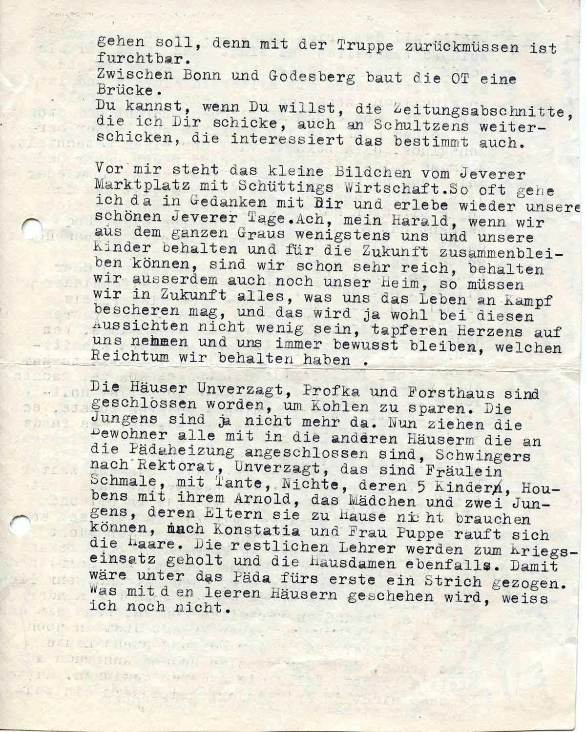 Vor mir steht das kleine Bildchen vom Jeverer Marktplatz mit Schüttings Wirtschaft. So oft gehe ich da in Gedanken mit Dir und erlebe wieder unsere schönen Jeverer Tage. Ach, mein Harald, wenn wir aus dem ganzen Graus wenigstens uns und unsere Kinder behalten und für die Zukunft zusammenbleiben können, sind wir schon sehr reich, behalten wir ausserdem noch unser Heim, so müssen wir in Zukunft alles, was uns das Leben an Kampf bescheren mag, und das wird ja wohl bei diesen Aussichten nicht wenig sein, tapferen Herzens auf uns nehmen und uns immer bewusst bleiben, welchen Reichtum wir behalten haben.