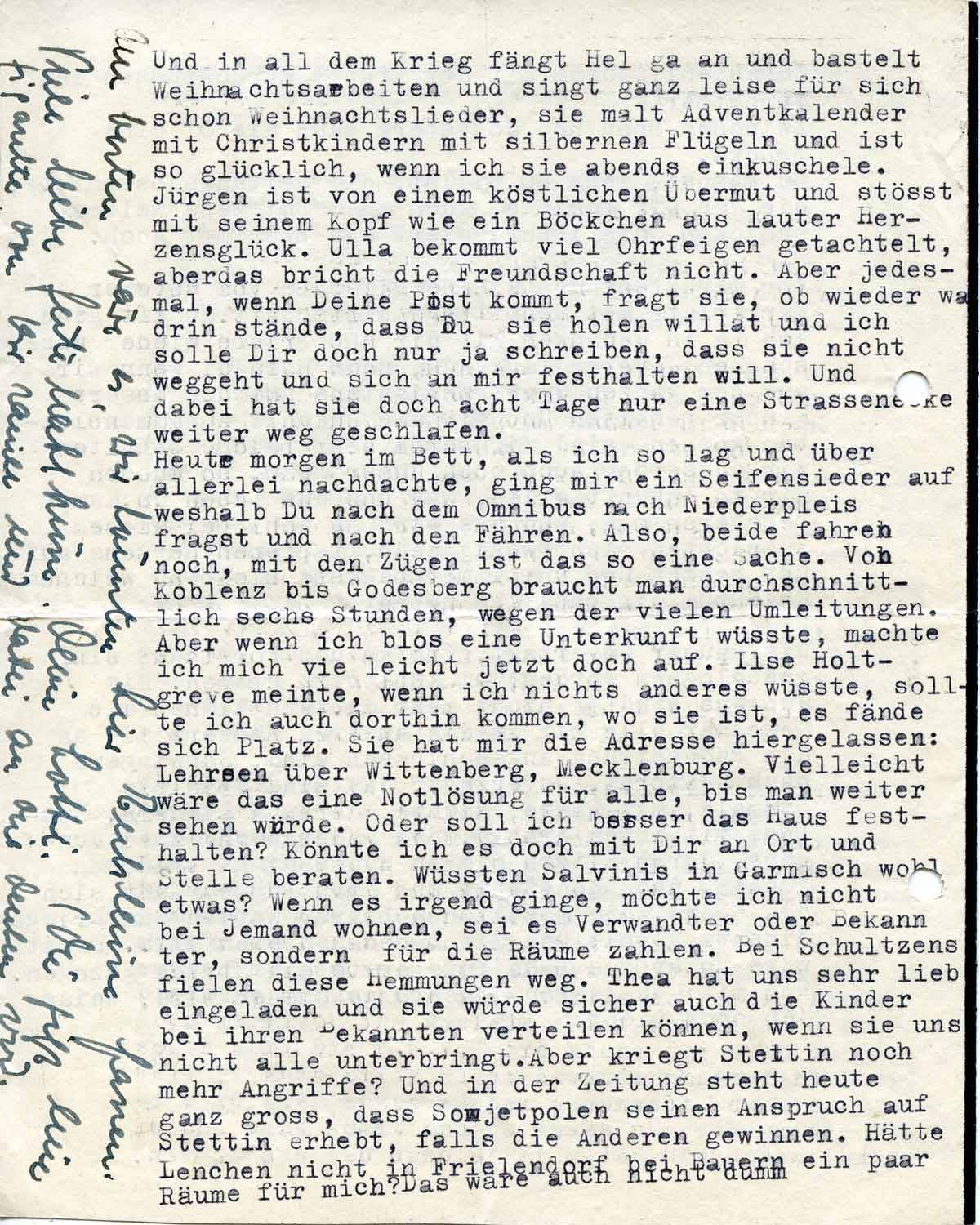 Ilse Holtgreve meinte, wenn ich nichts anderes wüsste, sollte ich auch dorthin kommen, wo sie ist, es fände sich ein Platz. Sie hat mir die Adresse hiergelassen: Lehrsen über Wittenberg, Mecklenburg. Vielleicht wäre das eine Notlösung für alle, bis man weiter sehen würde. Oder soll ich besser das Haus festhalten? Wüssten Salvinis in Garmisch wohl etwas? Wenn es irgend ginge, möchte ich nicht bei jemand wohnen, sei es Verwandter oder Bekannter, sondern für die Räume zahlen.