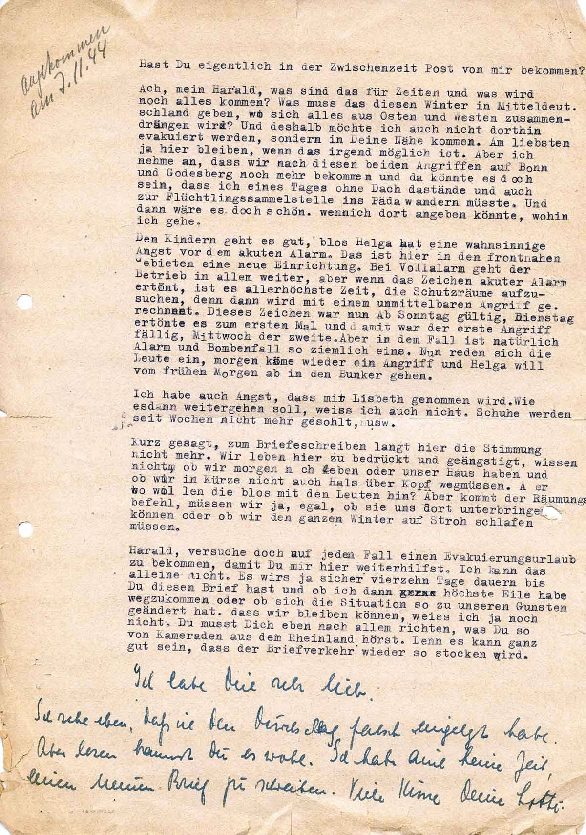 Harald, versuche doch auf jeden Falle einen Evakuierungsurlaub zu bekommen, damit Du mir hier weiterhilfst. Ich kann das alleine nicht. Es wird ja sicher vierzehn Tage dauern bis Du diesen Brief hast und ob ich dann höchste Eile habe wegzukommen oder ob sich die Situation so zu unseren Gunsten geändert hat, dass wir bleiben können, weiss ich ja noch nicht. Du musst Dich eben nach allem richten, was Du so von Kameraden aus dem Rheinland hörst. Denn es kann ganz gut sein, dass der Briefverkehr wieder so stocken wird.