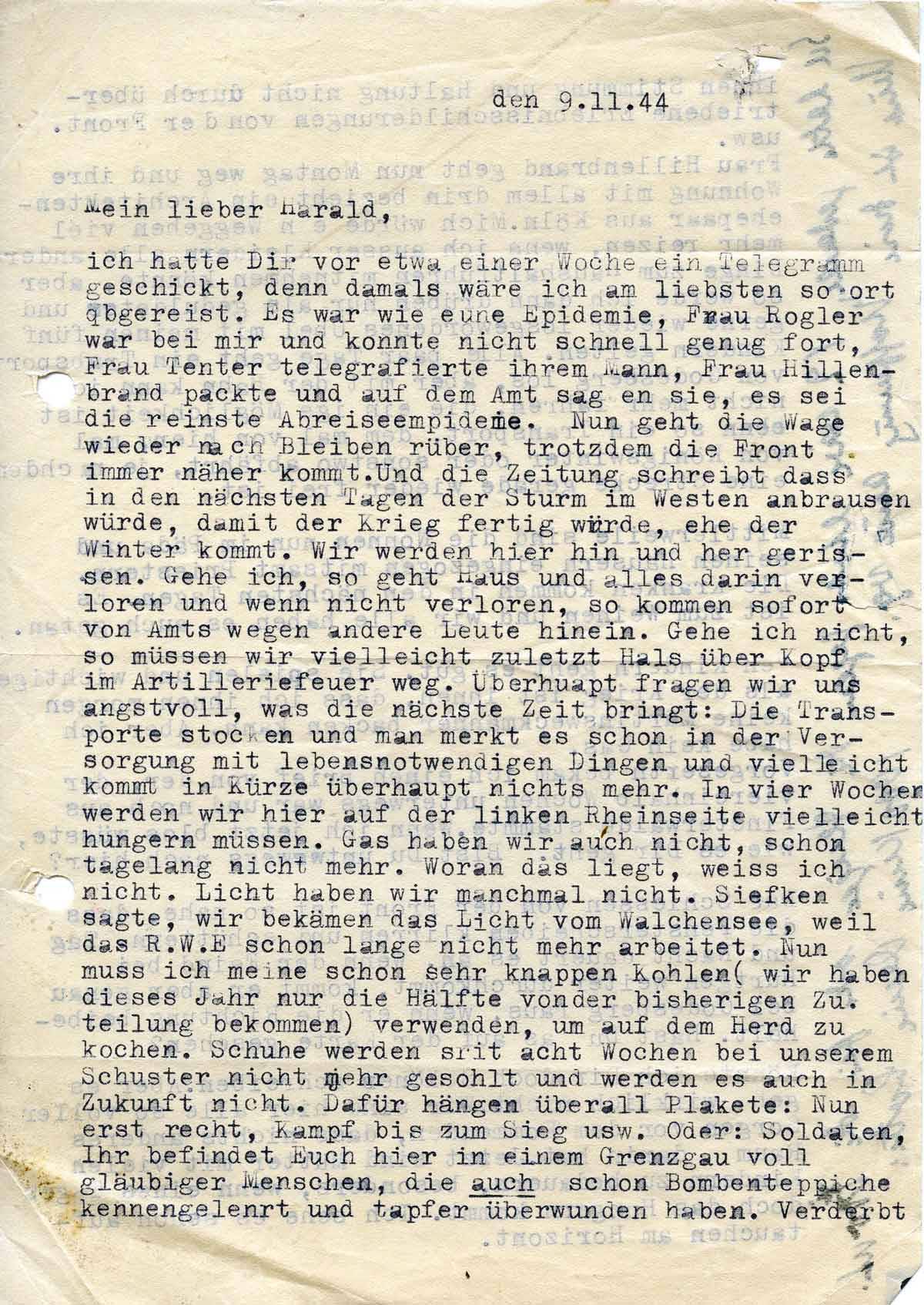 Charlotte Endemann an ihren Mann Harald, 9. November 1944