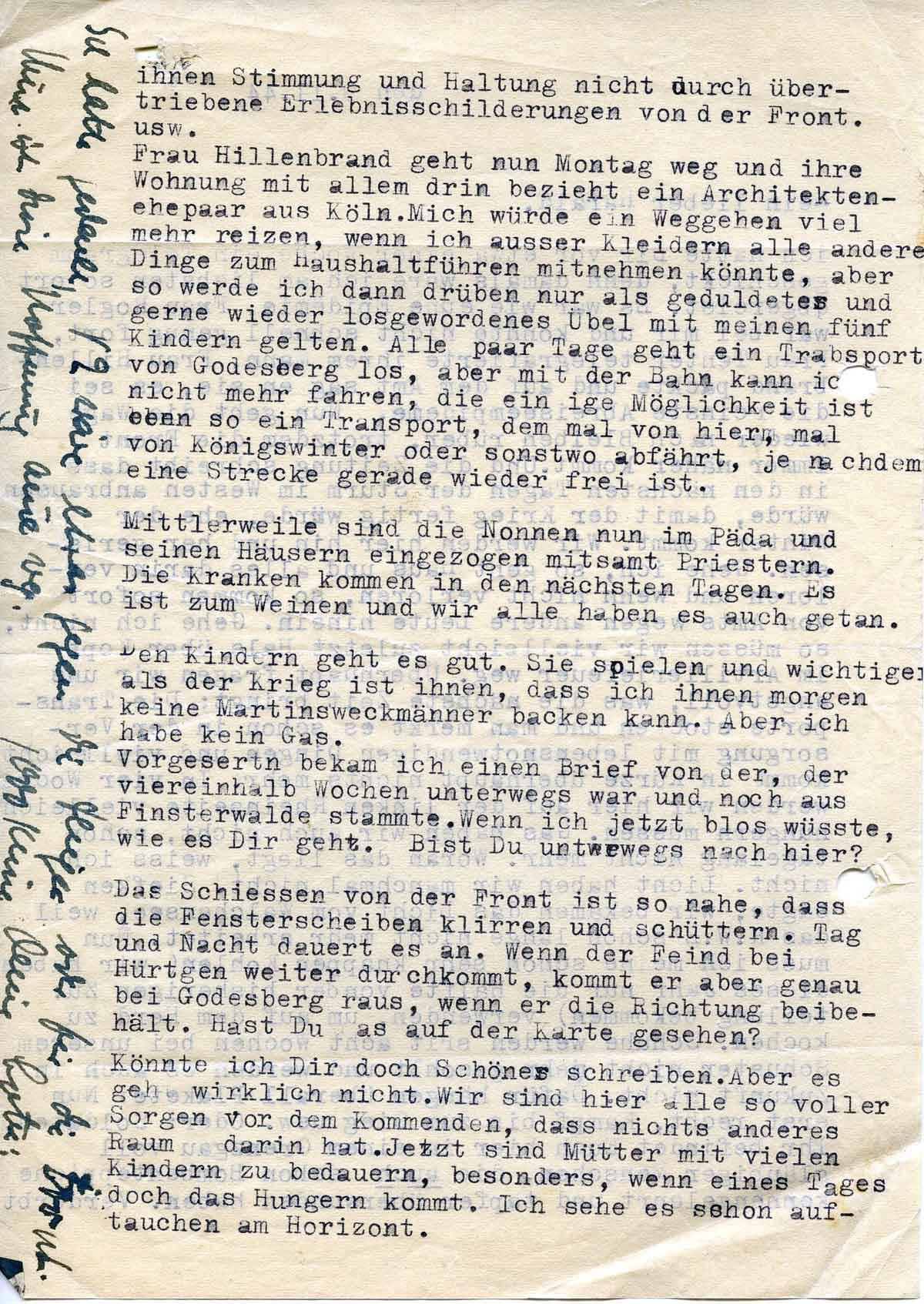 Das Schießen von der Front ist so nahe, dass die Fensterscheiben klirren und schüttern. Tag und Nacht dauert es an. Wenn der Feind bei Hürtgen weiter durchkommt, kommt er aber genau bei Godesberg raus, wenn er die Richtung beibehält. Hast Du es auf der Karte gesehen?