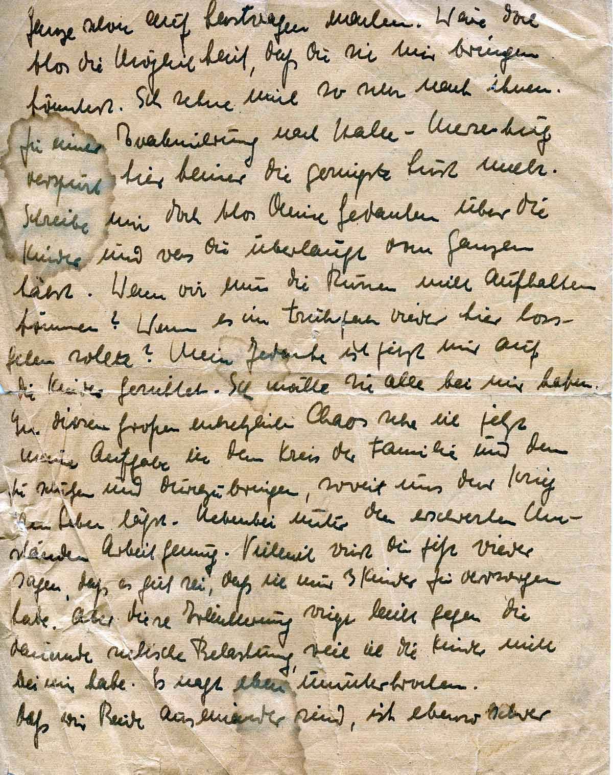 Mir selber ist reichlich schwer ums Herz.. Du und die Kinder unerreichbar, der Ansturm im Osten, die immer knapper werdende Lebensmittellage im Westen usw. Werde ich die Kinder vor Kriegsende wiedersehen, werde ich sei überhaupt noch einmal sehen? Bei Dir ist es etwas anderes. Du schlägst Dich schon zu uns durch, wenn die Gelegenheit da ist, aber Kinder sind hilflos. Ich wüsste mir auch keinen Rat, wie ich sie wiederholen soll. Erlaubnis für die Bahn bekomme ich nicht. Ich müsste das