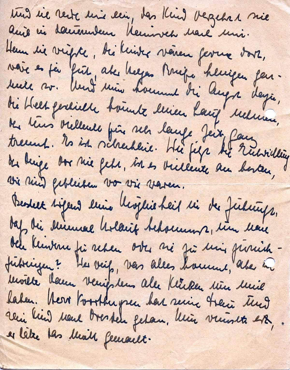 Ich leide augenblicklich am meisten durch die Abwesenheit der Kinder. Wie sehr, kann ich gar nicht sagen. Ich möchte sie liebhalten, in die Arme nehmen und stehe machtlos da. Immer geht mir die Zeile aus dem Lied von der Lilofee durch den Kopf: 'Meine Kindlein höre ich weinen nach mir...' und das zerrt dann ununterbrochen. Vielleicht ist es gar nicht der Fall, vielleicht sind sie vergnügt. Merkwürdigerweise beziehe ich es in der Hauptsache auf Helga,