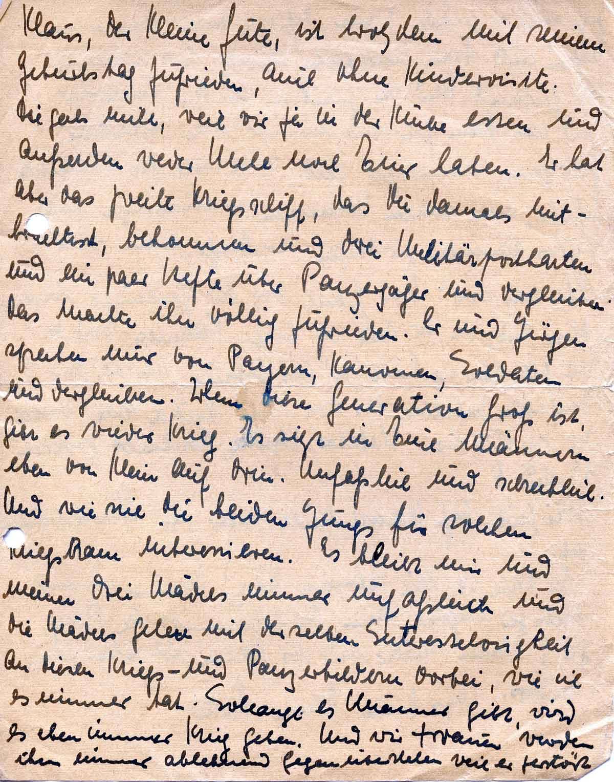 Klaus, der kleine, Gute, ist trotzdem mit seinem Geburtstagstisch zufrieden, auch ohne Kindervisite. Die gab's nicht, weil wir ja in der Küche essen müssen (das Esszimmer kann diesen Winter nicht geheizt werden) und außerdem weder Mehl noch Eier haben. Er hat aber das zweite Kriegsschiff, das Du damals mitbrachtest, bekommen und drei Militärpostkarten und ein paar Hefte über Panzerjäger und dergleichen. Das machte ihn völlig zufrieden. Er und Jürgen sprechen nur von Panzern, Kanonen, Soldaten und dergleichen. Wenn diese Generation groß ist, gibt es wieder Krieg. Es sitzt in Euch Männern anscheinend drin. Unfasslich und schrecklich. Und wie sich die beiden Jungs für solchen Kriegskram interessieren. Es bleibt mir und den Mädels immer unbegreiflich, und die Mädels gehen natürlich mit völliger Interesselosigkeit an diesen Kriegs- und Panzerbildern vorbei, wie sie es immer tat. Solange es Männer gibt, wird es wohl immer Krieg geben, und wir Frauen werden ihm immer ablehnend gegenüberstehenn weil er zerstört.