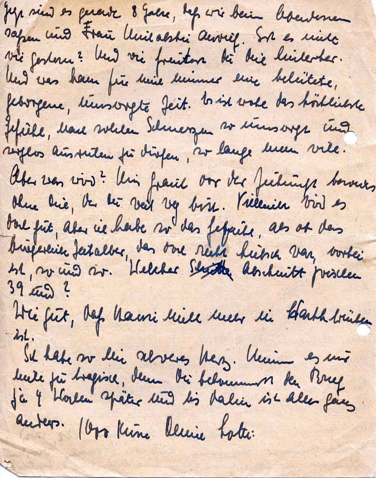 Aber was wird? Mir graut vor der Zukunft besonders ohne Dich, der Du weit weg bist. Vielleicht wird es doch gut, aber ich habe so das Gefühl, als ob das bürgerliche Zeitalter, das doch recht hübsch war, vorbei ist, so und so. Welcher Abschnitt zwischen 39 und ?