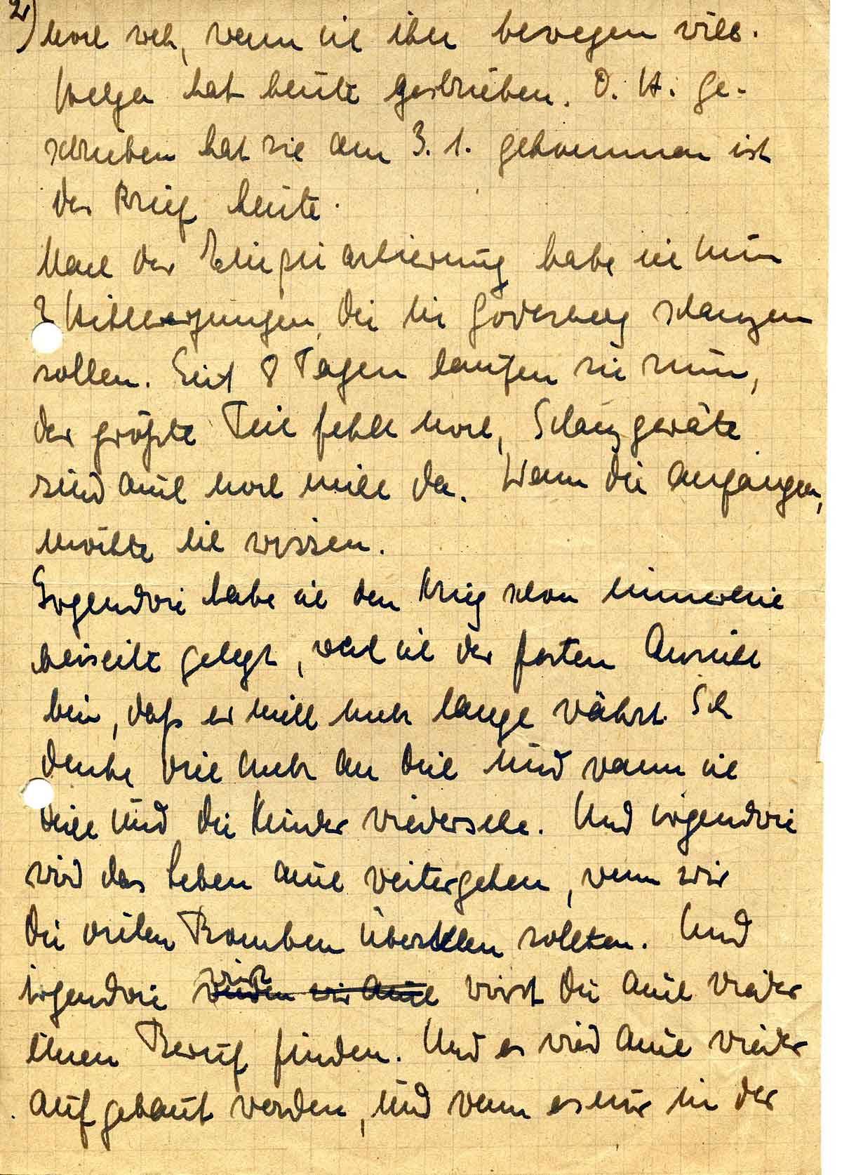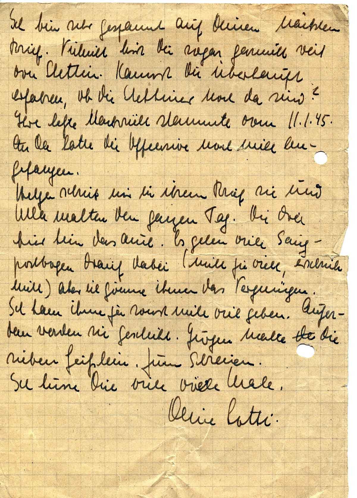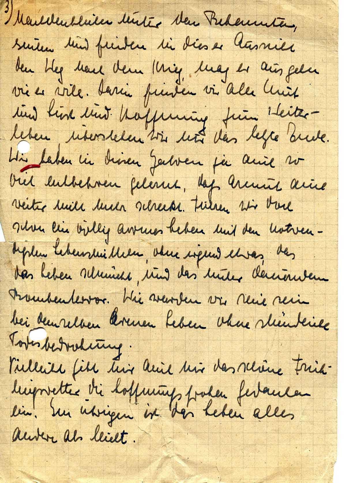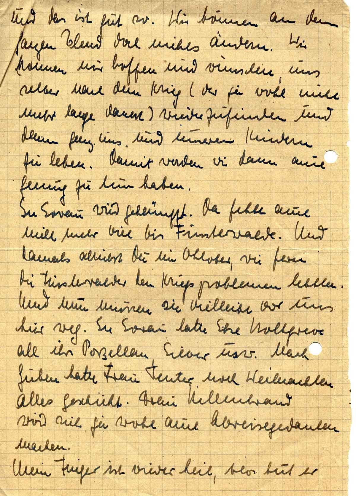 Irgendwie habe ich den Krieg schon innerlich beiseite gelegt, weil ich der festen Ansicht bin, dass er nicht mehr lange währt. Ich denke viel mehr an Dich und wann ich die Kinder wiedersehe. Und irgendwie wird das Leben auch weitergehen, wenn wir die vielen Bomben überstehen sollten. Und irgendwie wirst Du auch wieder einen Beruf finden. Und es wird auch wieder aufgebaut werden, und wenn es nur in der