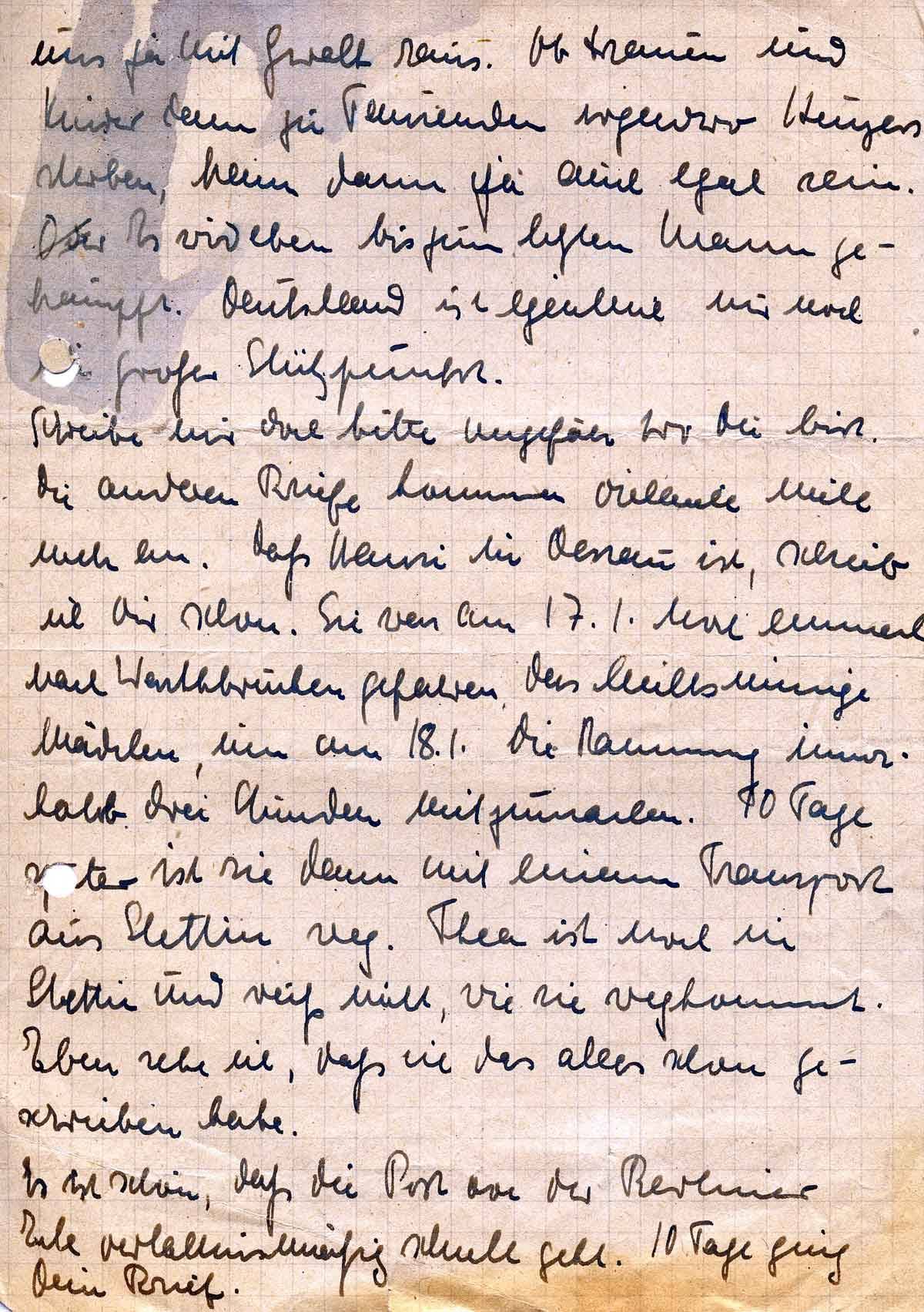 Schreibe mir bitte ungefähr, wo Du bist. Die anderen Briefe kommen vielleicht nicht mehr an. Dass Hansi in Dessau ist, schrieb ich Dir schon. Sie war an 17.1. noch einmal nach Warthbrücken gefahren, das leichtsinnige Mädchen, um am 18. die Räumung innerhalb drei Stunden mitzumachen. Zehn Tage später ist sie dann mit einem Transport aus Stettin weg. Thea ist noch in Stettin und weiß nicht, wie sie wegkommt. - Eben sehe ich, dass ich das alles schon geschrieben habe.