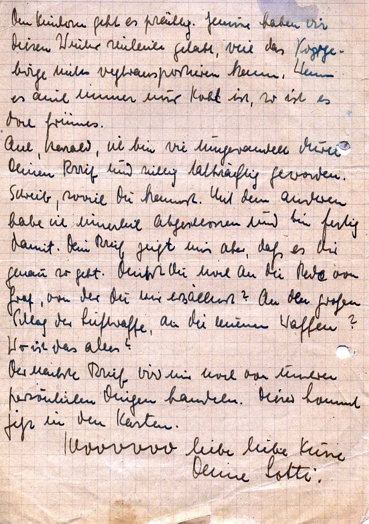 Ach, Harald, ich bin wie umgewandelt durch Deinen Brief und richtig tatkräftig geworden. Schreib, soviel Du kannst. Mit dem anderen habe ich innerlich abgeschlossen und bin fertig damit. Dein Brief zeigt mir aber, dass es Dir genau so geht. Denkst Du noch an die Rede von Kommodore Graf, von der Du mir erzähltest? An den großen Schlag der Luftwaffe, an die neuen Waffen? Wo ist das alles?