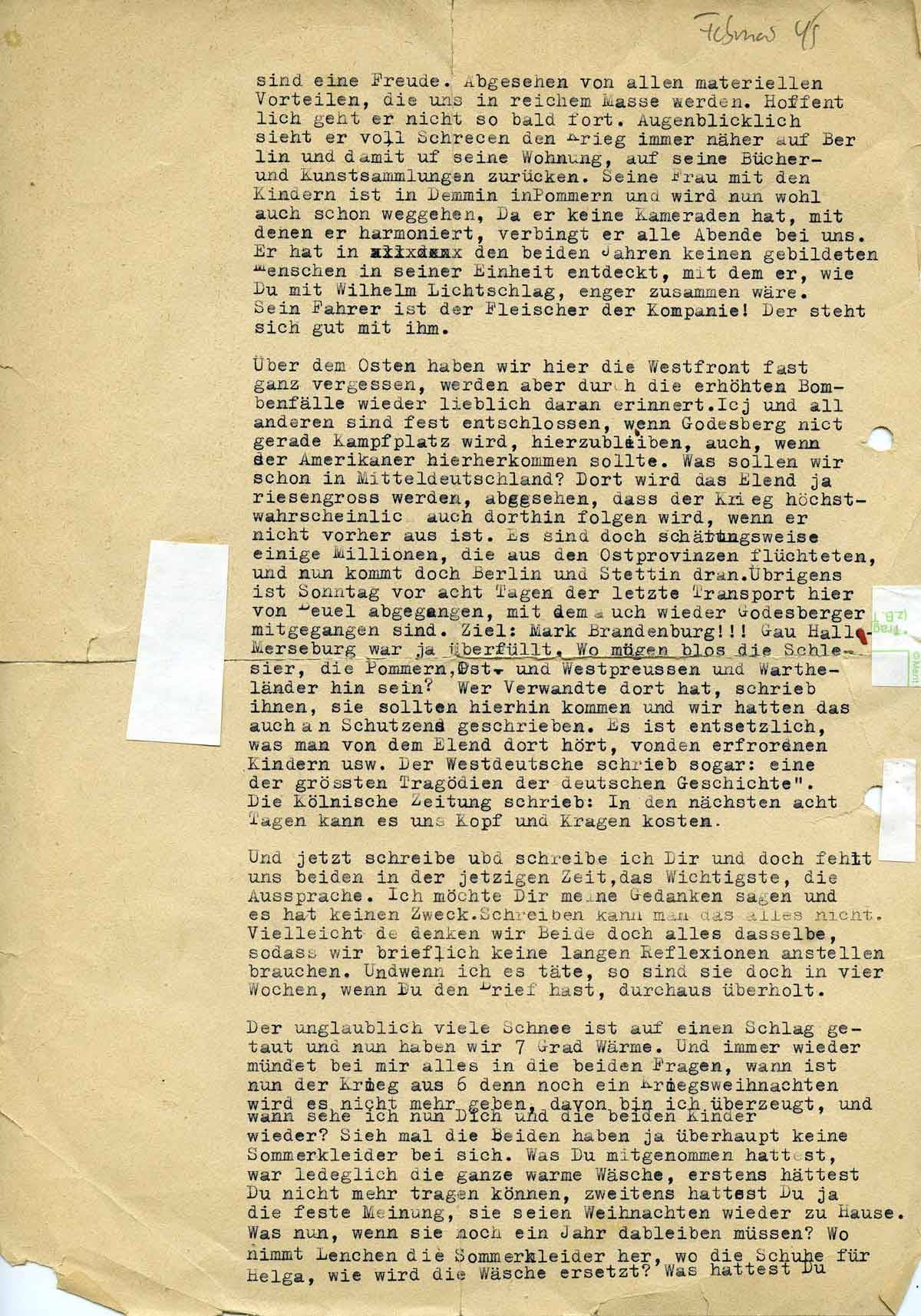 Über dem Osten haben wir hier die Westfront fast ganz vergessen, werden aber durch die erhöhten Bombenfälle wieder lieblich daran erinnert. Ich und alle andere sind fest entschlossen, wenn Godesberg nicht gerade Kampfplatz wird, hierzubleiben, auch wenn die Amerikaner hierher kommen sollten. Was sollen wir schon in Mitteldeutschland? Dort wird das Elend ja riesengroß werden, abgesehen davon, dass der Krieg höchstwahrscheinlich auch dorthin folgen wird, wenn er nicht vorher aus ist. Es sind doch schätzungsweise einige Millionen, die aus den Ostprovinzen flüchteten, und nun kommt so doch Berlin und Stettin dran. Übrigens ist Sonntag vor acht Tagen der letzte Transport hier von Beuel abgegangen, mit dem auch wieder Godesberger abgegangen sind. Ziel: Mark Brandenburg!!! Gau Halle. Merseburg war ja überfüllt. Wo mögen bloß die Schlesier, die Pommern und Westpreußen und Wartheländer hin sein?