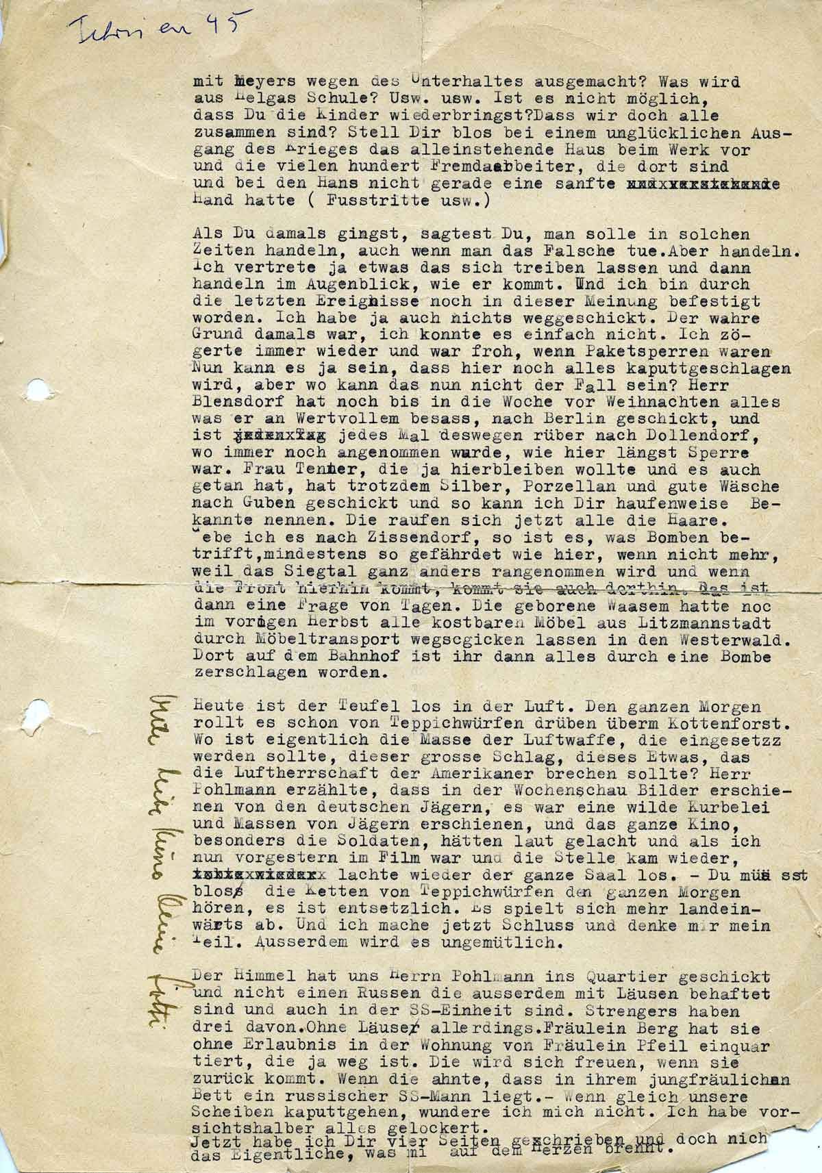 Ist es nicht möglich, dass Du die Kinder wiederbringst? Dass wir doch alle zusammen sind? Stell Dir bloß bei einem unglücklichen Ausgang des Krieges das alleinstehende Haus beim Werk vor und die vielen hundert Fremdarbeiter, die dort sind und bei denen Hans nicht gerade eine sanfte Hand hatte (Fußtritte usw.)