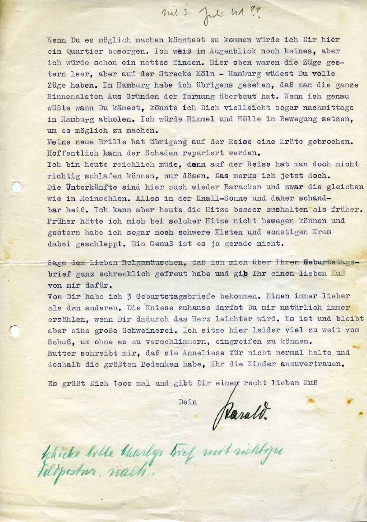 Wenn Du es möglich machen könntest zu kommen würde ich Dir hier ein Quartier besorgen. Ich weiß im Augenblick noch keines, aber ich würde schon ein nettes finden. Hier oben waren die Züge gestern leer, aber auf der Strecke Köln- Hamburg würdest Du volle Züge haben. In Hamburg habe ich übrigens gesehen, daß man die ganze Binnenalster aus Gründen der Tarnung überbaut hat. Wenn ich genau wüßte wann Du kämest, könnte ich Dich vielleicht sogar nachmittags in Hamburg abholen. Ich würde Himmel und Hölle in Bewegung setzen, um es möglich zu machen. Meine neue Brille hat übrigens auf der Reise eine Kräte (?) gebrochen. Hoffentlich kann der Schaden repariert werden.