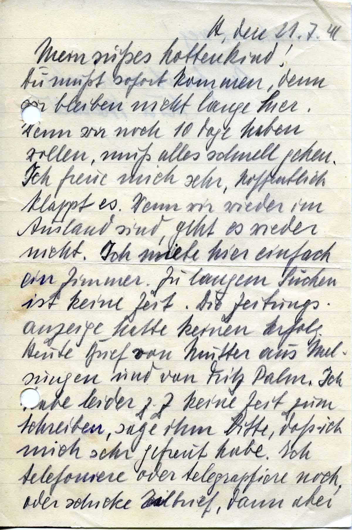 Du mußt sofort kommen, denn wir bleiben nicht lange hier. Wenn wir noch 10 Tage haben wollen, muß alles schnell gehen. Ich freue mich sehr, hoffentlich klappt es. Wenn wir wieder im Ausland sind, geht es wieder nicht. Ich miete hier einfach ein Zimmer. Zu langem Suchen ist keine Zeit. Die Zeitungsanzeige hatte keinen Erfolg. Heute Brief von Mutter aus Melsungen und von Fritz Palm. Ich habe leider z.Z. keine Zeit zum Schreiben, sage ihm bitte, daß ich mich sehr gefreut habe. Ich telefoniere oder telegraphiere noch, oder schicker Eilbrief, dann aber