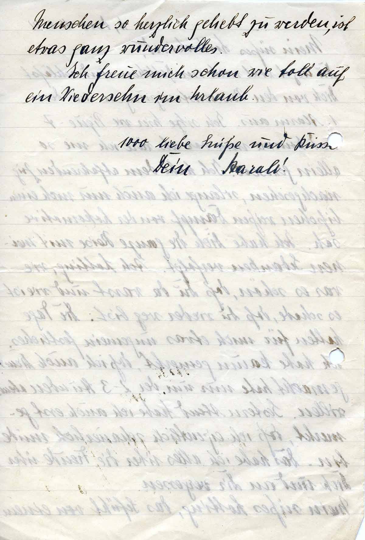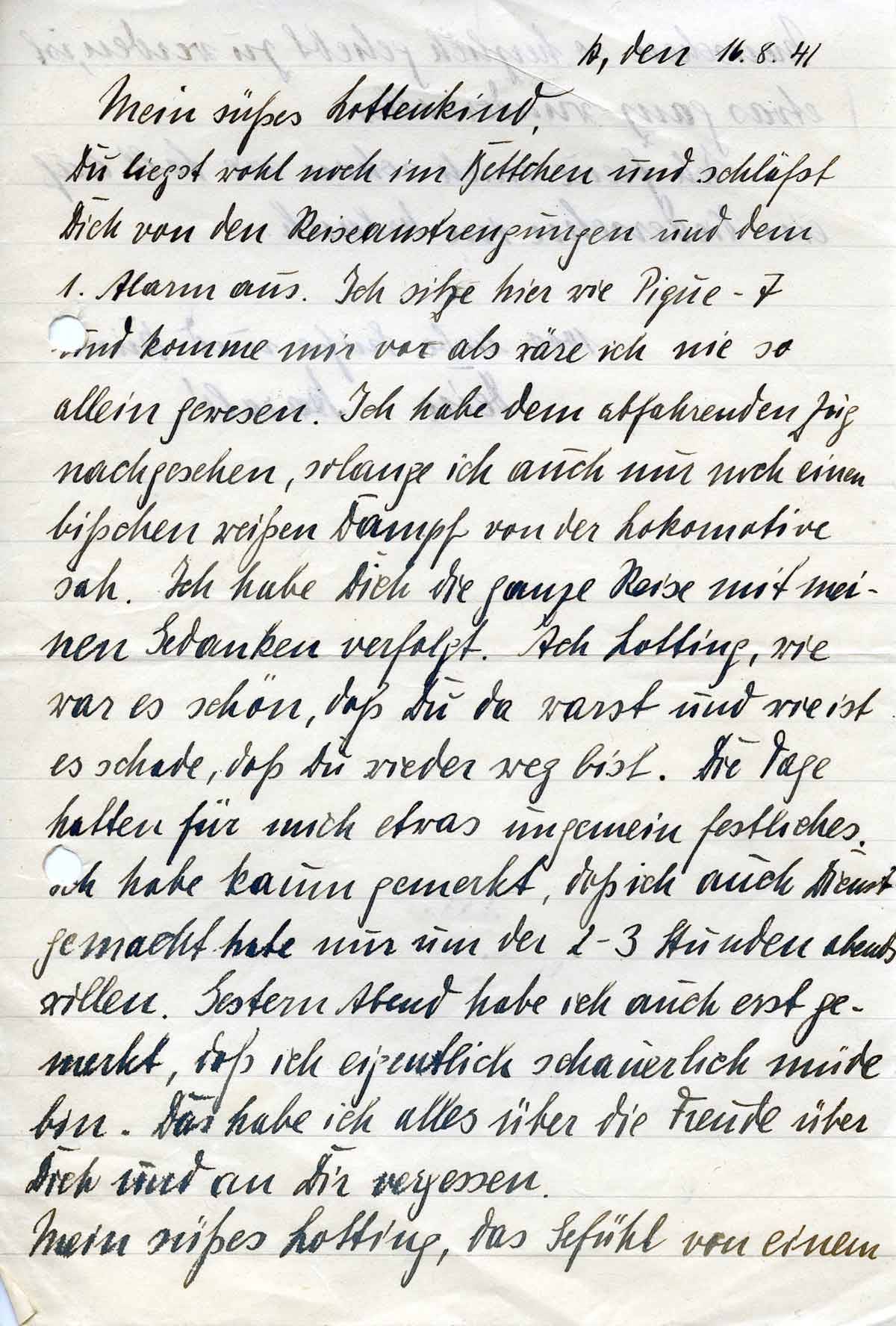 Du liegst wohl noch im Bettchen und schläfst Dich von den Reiseanstrengungen und dem 1. Alarm aus. Ich sitze hier wie Pique-7 und komme mir vor als wäre ich nie so allein gewesen. Ich habe dem abfahrenden Zug nachgesehen, solange ich auch nur noch ein bißchen weißen Dampf von der Lokomotive sah. Ich habe Dich die ganze Reise mit meinen Gedanken verfolgt. Ach Lotti, wie war es schön, daß Du da warst und wie ist es schade, daß Du wieder weg bist. Die Tage hatten für mich etwas ungemein festliches. Ich habe kaum gemerkt, dass ich auch Dienst gemacht habe nur um der 2-3 Stunden abends willen. Gestern Abend habe ich auch erst gemerkt, dass ich eigentlich schauerlich müde bin. Das habe ich alles über die Freude über Dich und an Dir vergessen. Mein süßes Lotti, das Gefühl von einem