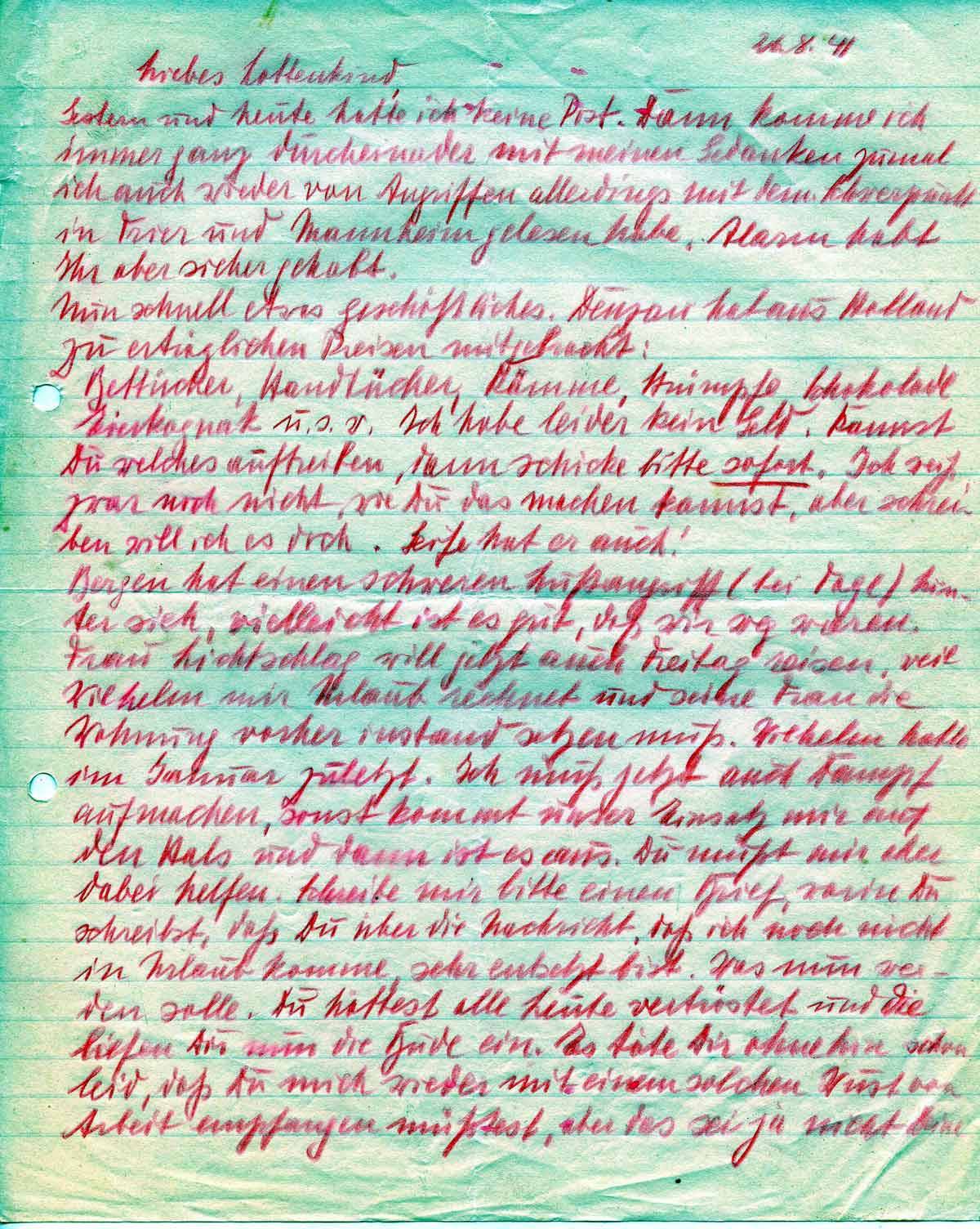 Bettücher, Handtücher, Kämme, Strümpfe Schokolade Eierkognak usw. ich habe leider kein Geld. Kannst Du welches auftreiben, dann schicke bitte sofort. Ich weiß zwar noch nicht, wie Du das machen kannst, aber schreiben will ich es doch. Seife hat er auch!