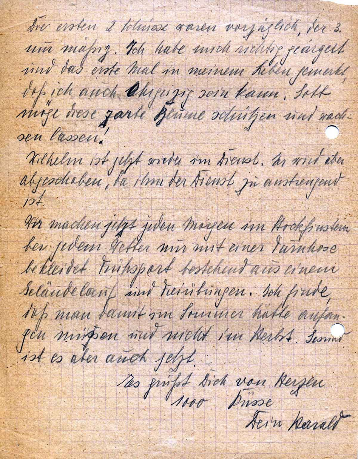Wir machen jetzt jeden Morgen im Stockfinstern bei jedem Wetter nur mit einer Turnhose bekleidet Frühsport bestehend aus einem Geländelauf und Freiübungen. Ich finde, daß man damit im Sommer hätte anfangen müssen und nicht im Herbst. Gesund ist es aber auch jetzt.