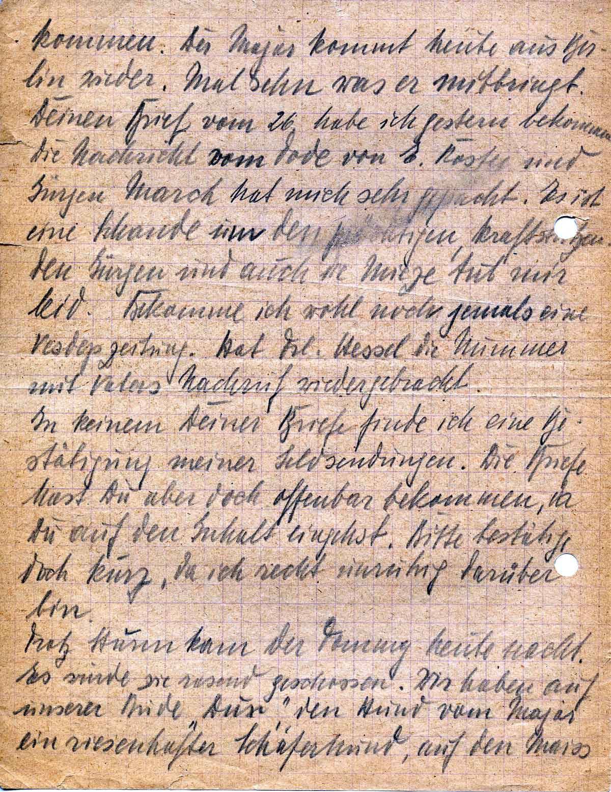kommen. Der Major kommt heute aus Berlin wieder. Mal sehn was er mitbringt. Deinen Brief vom 26. habe ich gestern bekommen. Die Nachricht vom Tode von E. Köster und Jürgen March hat mich sehr gepackt. Es ist eine Schande um den prächtigen, kraftstrotzenden Jürgen und auch die Mieze tut mir leid. Bekomme ich wohl noch jemals eine Vesdepzeitung. Hat Frl. Hessel die Nummer mit Vaters Nachruf wiedergebracht.