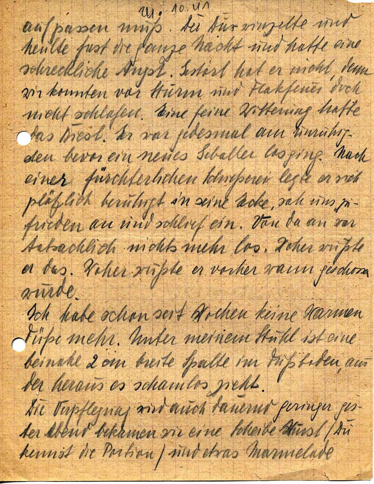 Ob dieser Sturm wohl jemals wieder aufhören wird? Er tobt jetzt schon seit zwei Tagen und wie. Alles bebt auf der Insel. Die See brüllt uns nachts wach, Sand von den Dünen fegt über die ganze Insel und tut auf der Haut W. Wir haben uns bisher dadurch geholfen daß wir wie die Verrückten geheizt haben. Die Baracken hier sind so schlecht und vom Sturm verzogen, daß es an allen Ecken hereinbläst. Es wurden dadurch natürlich ungeheuere Mengen Kohlen verbraucht 4-5 Eimer pro Stube. Das ist jetzt verboten. Vor den Kohlen steht ein Posten unter Gewehr. Es gibt nur noch einen Eimer pro Stube. Der Erfolg ist, daß es überall hundekalt ist. Wir machen es bei uns so, daß wir nur abends heizen, da wir tagsüber im Büro sind. Dann geht es. Es wird aber doch Zeit, daß wir aus diesem zugigen Winkel raus-