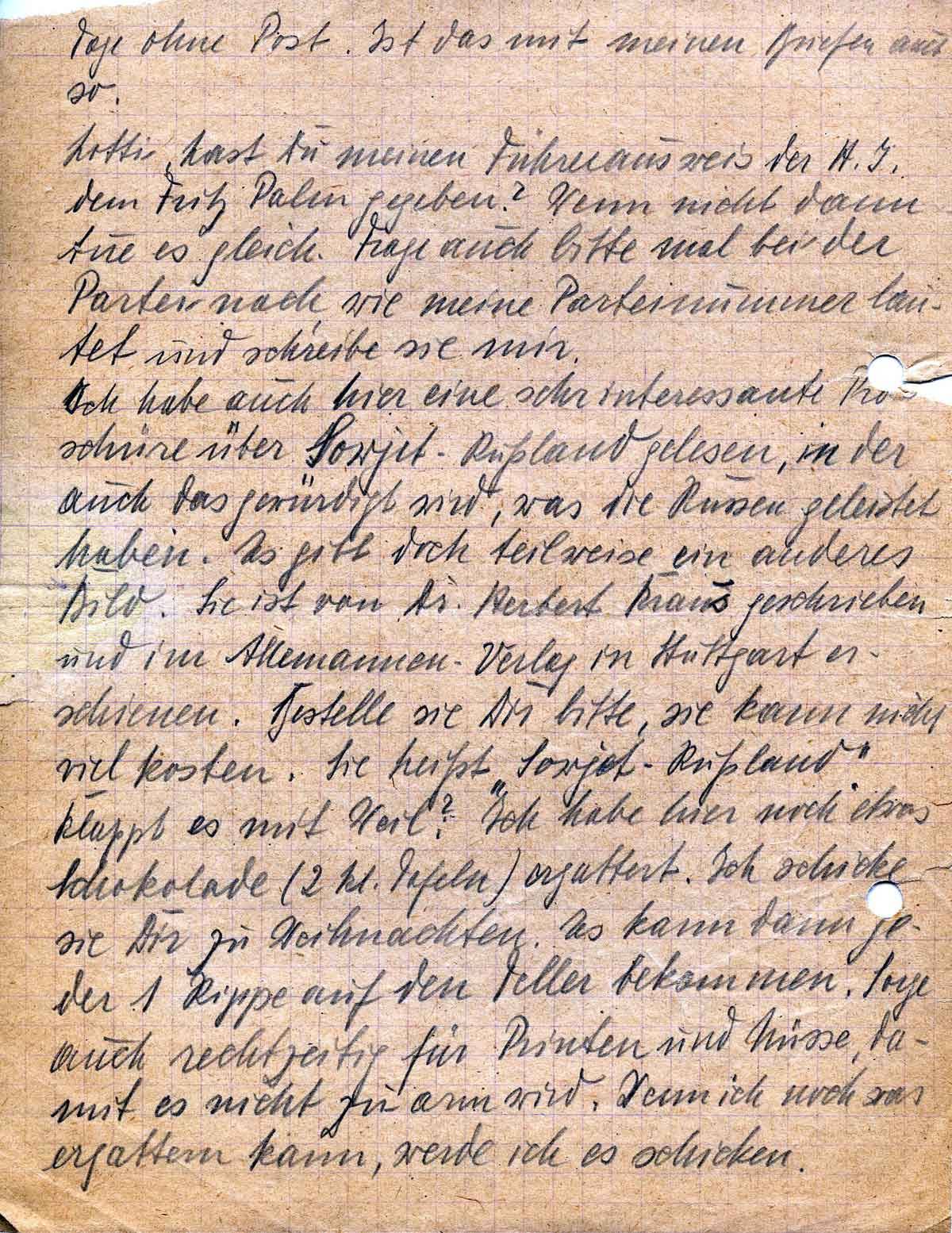 Ich habe auch hier eine sehr interessante Broschüre über Sowjet-Russland gelesen, in der auch das gewürdigt wird, was die Russen geleistet haben. Es gibt doch teilweise ein anderes Bild. Sie ist von Dr. Herbert Kraus geschrieben und im Allemannen- Verlag in Stuttgart erschienen. Bestellen Sie Dir bitte, sie kann nicht viel kosten. Sie heißt “ Sowjet- Rußland“. Klappt es mit Weil? Ich habe hier noch etwas Schokolade (2 kl. Tafeln) ergattert. Ich schicke sie Dir zu Weihnachten. Es kann dann jeder 1 Rippe auf den Teller bekommen. Sorge auch rechtzeitig für Printen und Nüsse, damit es nicht zu arm wird. Wenn ich noch was ergattern kann, werde ich es schicken.