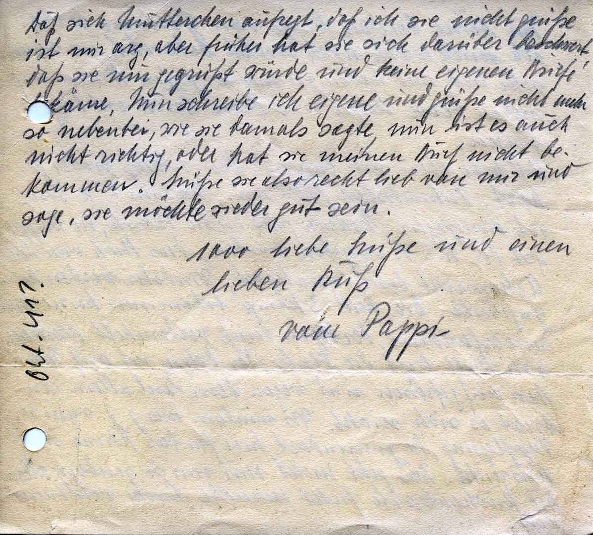 Daß sich Muttern aufregt, daß ich nicht grüße ist mir arg, aber früher hat sie sich darüber beschwert, daß sie nur gegrüßt würde und keine eigenen Briefe bekäme. Nun schreibe ich eigene und grüße nicht mehr so nebenbei, wie sie sind damals sagte, nun ist es auch nicht richtig, oder hat sie meinen Brief nicht bekommen. Grüße sie also recht lieb von mir und sage, sie möchte wieder gut sein.
