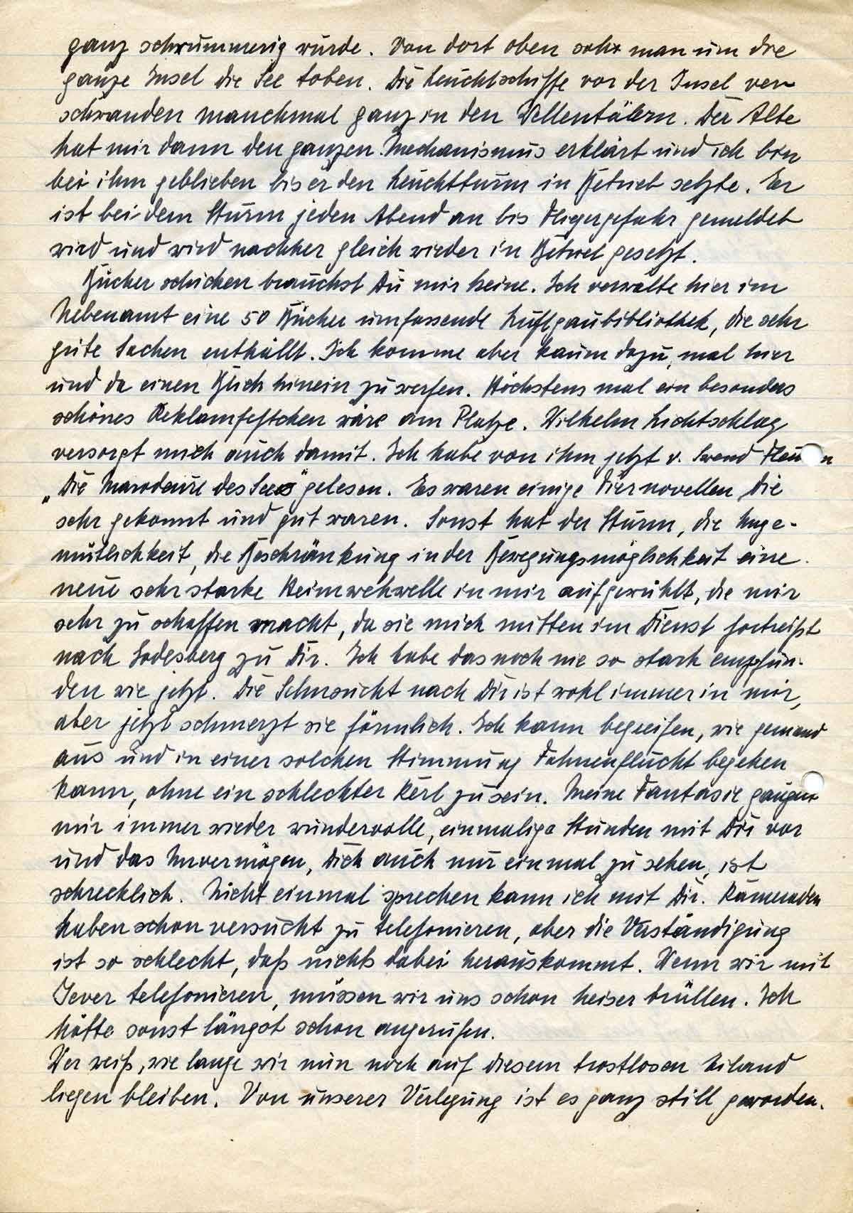 Ich habe heute mit großem Genuss die Novelle Immensee ausgelesen. Sie ist meisterhaft und hat mich stark beeindruckt. Mit Entsetzen habe ich mir ausgemalt, dass es mir leicht ähnlich hätte ergehen können. Ich glaube, mein späteres Leben wäre verpfuscht gewesen. Ich lese hier und da etwas, je nachdem es die Zeit erlaubt, denn meiner Leidenschaft, dem Spazierengehen kann ich bei dem Sturm nicht nachgehen. Jeder Schritt ist Kampf mit dem Element. Ich hatte heute seit langem mal wieder einen freien Nachmittag. Mit dem Sturm im Rücken bin ich in den Ort gesaust und habe ein Glas Glühwein getrunken, dann bin ich auf den Leuchtturm ge klettert und habe mit dem alten Wärter ein Schwätzchen gehalten. Der große steinerne Turm schwankte hin und her im Sturm, sodaß es einem manchmal