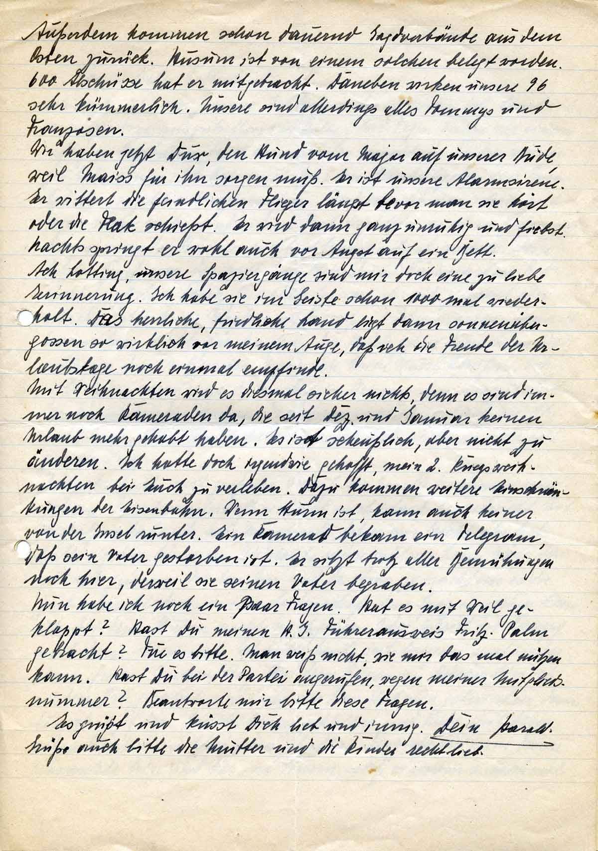 Wir haben jetzt Dux, den Hund vom Major auf unserer Bude, weil Maiss für ihn sorgen muß. Er ist unsere Alarmsirene. Er wittert die feindlichen Flieger längst bevor man sie hört oder die Flak schießt. Er wird dann ganz unruhig und fiebst. Nachts springt er wohl auch vor Angst auf ein Bett.