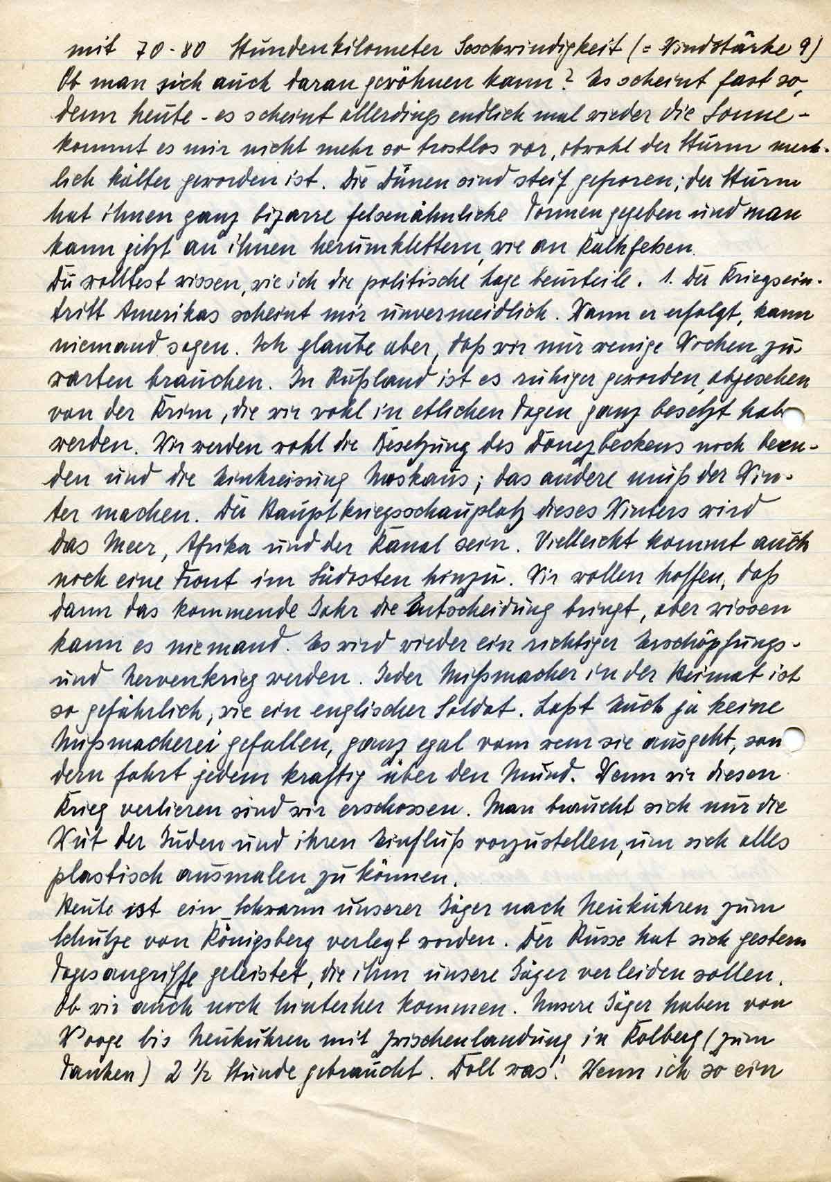 Du wolltest wissen, wie ich die politische Lage beurteile. 1. Der Kriegseintritt Amerikas erscheint mir unvermeidlich. Wann er erfolgt, kann niemand sagen. Ich glaube aber, daß wir nur wenige Wochen zu warten brauchen. In Rußland ist es ruhiger geworden, abgesehen von der Krim, die wir wohl in etlichen Tagen ganz besetzt haben werden. Wir werden wohl die Besetzung des Donezbeckens noch beenden und die Einkreisung Moskaus; das andere muß der der Winter machen. Der Hauptkriegsschauplatz dieses Winters wird das Meer, Afrika und der Kanal sein. Vielleicht kommt auch noch eine Front im Südosten hinzu. Wir wollen hoffen, daß dann das kommende Jahr die Entscheidung bringt, aber wissen kann es niemand. Es wird wieder ein richtiger Erschöpfungs- und Nervenkrieg werden. Jeder Mießmacher in der Heimat ist so gefährlich, wie ein englischer Soldat. Lasst Euch ja keine Mießmacherei gefallen, ganz egal von wem sie ausgeht, sondern fahrt jedem kräftig über den Mund. Wenn wir diesen Krieg verlieren sind wir erschossen. Man braucht sich nur die Wut der Juden und ihren Einfluss vorzustellen, um sich alles plastisch ausmalen zu können.