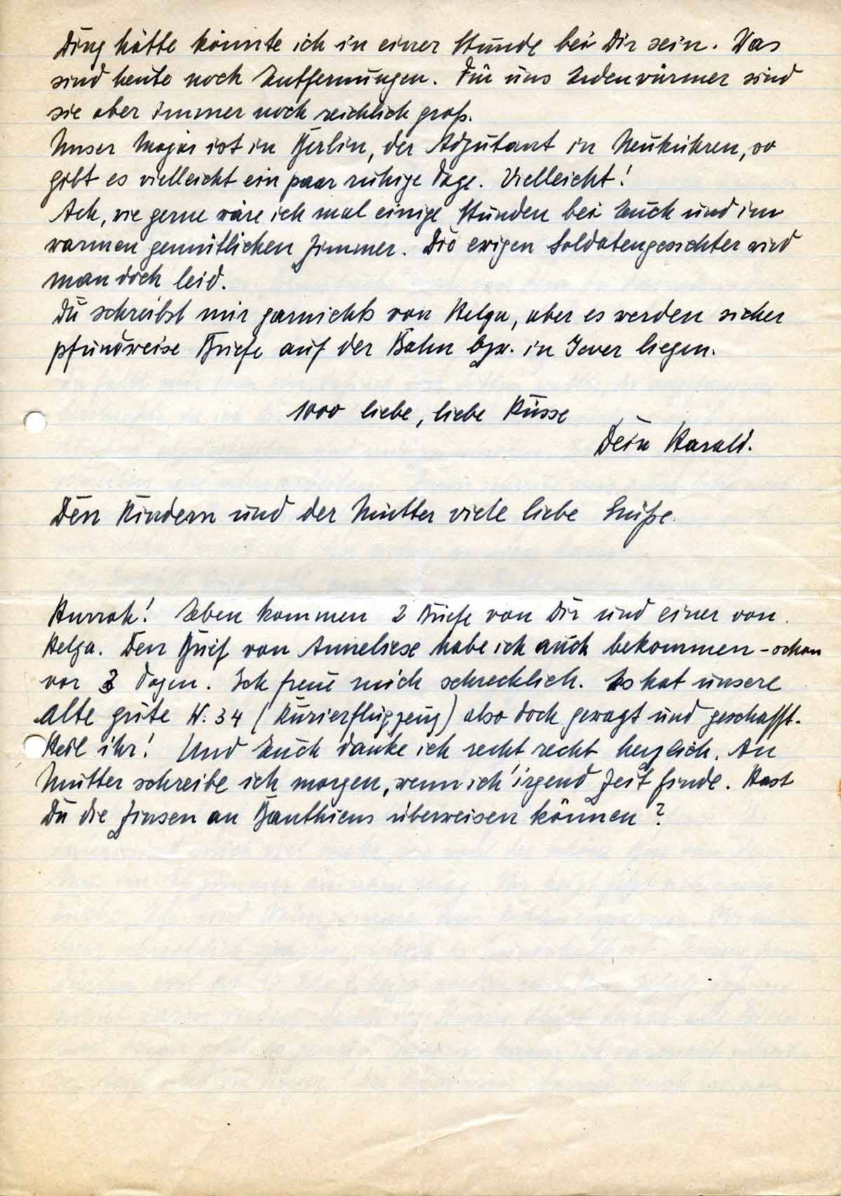 Hurrah! Eben kommen 2 Briefe von Dir und einer von Helga. Den Brief von Anneliese habe ich auch bekommen – schon vor 3 Tagen. Ich freue mich schrecklich. Es hat unsere alte gute W.34 (Kurierflugzeug) also doch gewagt und geschafft. Heil ihr! Und Euch danke ich recht herzlich. An Mutter schreibe ich morgen, wenn ich irgend Zeit finde. Hast Du die Zinsen an Banthiens überweisen können?