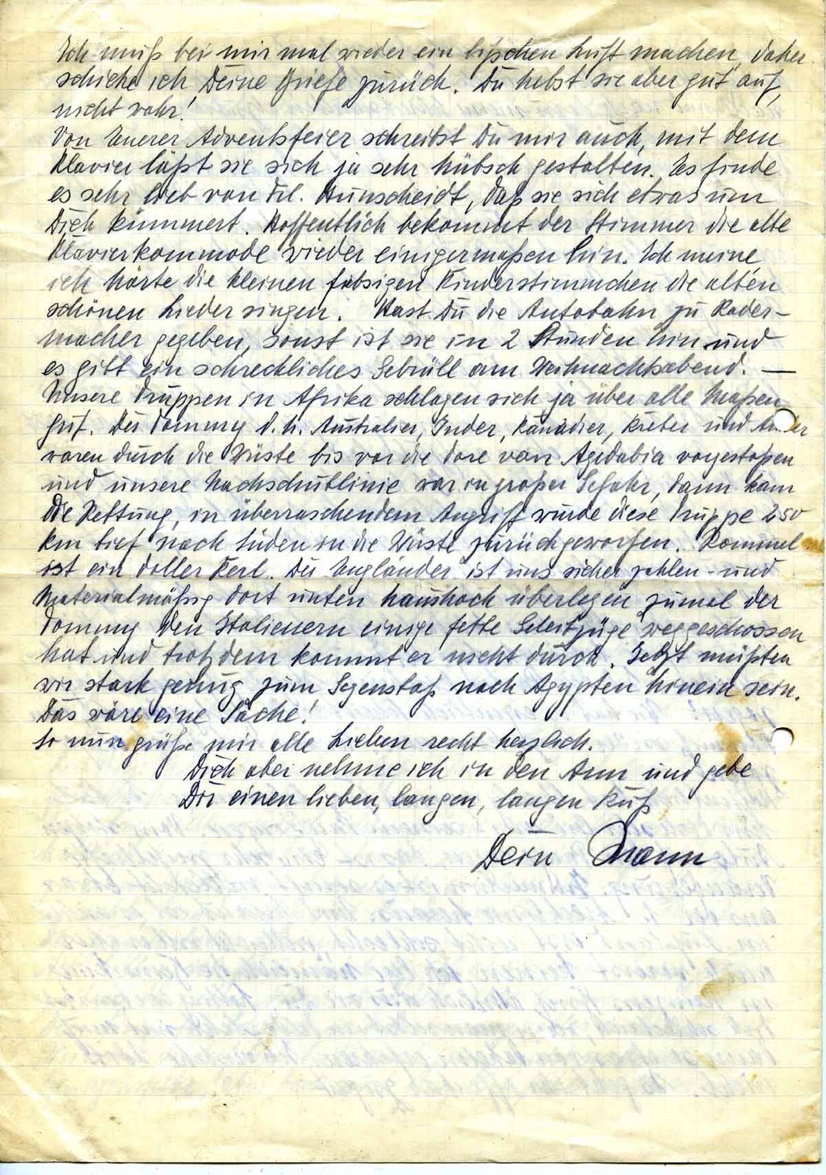 Unsere Truppen in Afrika schlagen sich ja über alle Maßen gut. Der Tommy, d.h. Australier, in der, Kanadier, Kreter und Araber waren durch die Wüste bis vor die Tore von Agedabia vorgestoßen und unsere Nachschublinie war in großer Gefahr, dann kam die Rettung, in überraschendem Angriff wurde diese Truppe 250 km tief nach Süden in die Wüste zurückgeworfen. Rommel ist ein toller Kerl. Die Engländer sind uns sicher zahlen- und materialmäßig dort unten haushoch überlegen zumal der Tommy den Italienern einige fette Geleitszüge weggeschossen hat und trotzdem kommt er nicht durch. Jetzt müßten wir stark genug zum Gegenstoß nach Ägypten hinein sein. Das wäre eine Sache!