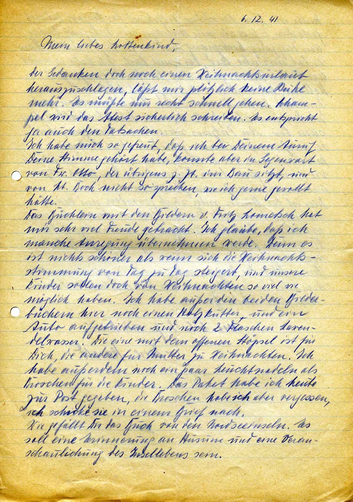 Das Büchlein mit den Bildern v. Fritz Lometsch hat mir sehr viel Freude gebracht. Ich glaube, daß ich manche Anregung übernehmen werde. Denn es ist nicht schöner als wenn sich die Weihnachtsstimmung von Tag zu Tag steigert, und unsere Kinder sollen doch von Weihnachten so viel wie möglich haben. Ich habe außer den beiden Bilderbüchern hier noch einen Holzkutter und ein Auto aufgetrieben und noch 2 Flaschen Lavendelwasser. Die eine mit dem offenen Stöpsel ist für Dich, die andere für Mutter zu Weihnachten. Ich habe außerdem noch ein paar Leuchtnadeln als Broschen für die Kinder. Das Paket habe ich heute zur Post gegeben, die Broschen habe ich aber vergessen, und schicke sie in einem Brief nach.