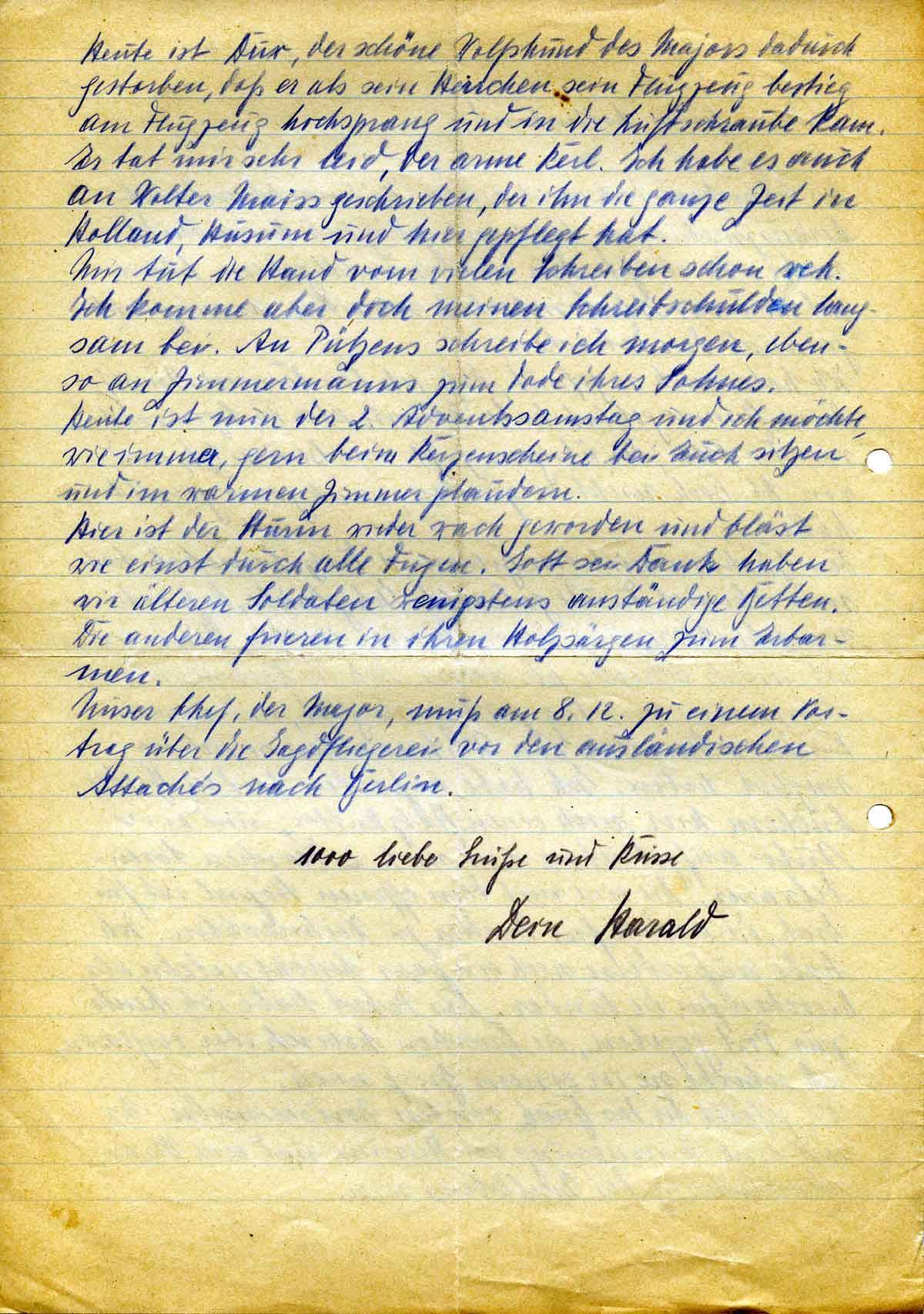 Heute ist Dux, der schöne Wolfshund des Majors dadurch gestorben, dass er als sein Herrchen sein Flugzeug bestieg am Flugzeug hochsprang und in die Luftschraube kam. Er tat mir sehr leid, der arme Kerl. Ich habe es auch an Walter Maiss geschrieben, der ihn die ganze Zeit in Holland, Husum und hier gepflegt hat.