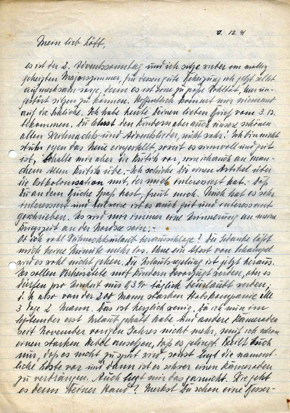 es ist der 2. Adventssonntag und ich sitze wieder im mollig geheizten Major Zimmer, für dessen gute Beheizung nicht jetzt selber aufmerksam sorge, denn es ist eine zu große Wohltat, hier ungestört sitzen zu können. Hoffentlich kommt mir niemand auf die Schliche. Ich habe heute Deinen lieben Brief vom 3.12. bekommen. Du lehrst den Kindern aber auch unsere schönen alten Weihnachts- und Adventslieder, nicht wahr! Ich bin nicht stuhr gegen das Neue eingestellt, soweit es sinnvoll und gut ist, behalte mir aber die Kritik vor, sowie ich auch an manchem Alten Kritik übe. – Ich schicke Dir einen Artikel über die Ostkolonisation mit, der mich interessiert hat. Daß Du an dem Buche Spaß hast, freut mich mich hat es sehr interessiert und teilweise ist es auch gut und interessant geschrieben. Es wird mir immer eine Erinnerung an meine Kriegszeit an der Nordsee sein. – Ob ich wohl Weihnachtsurlaub heraus schlage? Der Gedanke läßt mich keine Minute mehr los. Ohne ein Atest von Schampel wird es wohl nicht gehen. Die Urlaubsregelung ist jetzt heraus. Es sollen Verheiratete mit Kindern bevorzugt werden, aber es dürfen pro Einheit nur 0,3 % täglich beurlaubt werden; d.h. also von der 200 Mann starken Stabskompanie alle 3 Tage 2 Mann. Das ist herzlich wenig, da ich nun im September erst Urlaub gehabt habe und andere Kameraden seit November vorigen Jahres nicht mehr, muss ich schon einen starken Hebel ansetzen, daß es gelingt. Beeilt Euch nur, daß es nicht zu spät wird kommen, sonst liegt die namentliche Liste vor und ab dann ist es schwer einen Kameraden zu verdrängen. Auch liegt mir das garnicht. Wie geht es denn Deiner Hand? Merkst Du schon eine Besser-