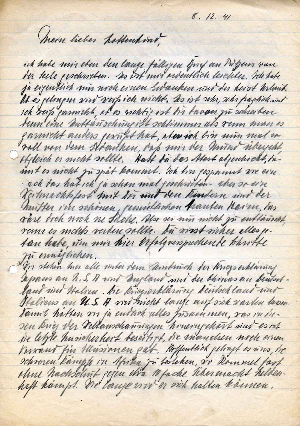 Wir stehen hier alle unter dem Eindruck der Kriegserklärung Japans an U.S.A. und England und der Chinas an Deutschland und Italien. Die Kriegserklärung Deutschlands und Italiens an U.S.A wird nicht lange auf sich warten lassen. Damit hätten wir ja endlich alles zusammen, was in diesen Krieg der Weltanschauungen hineingehört und es ist die letzte Unsicherheit beseitigt, die manchen noch einen Vorwand für Illusionen gab. Hoffentlich gelingt es uns, die schweren Kämpfe in Afrika zu bestehen, wo Rommel fast ohne Nachschub gegen etwa 10fache Übermacht heldenhaft kämpft. Wie lange wird er sich halten können.