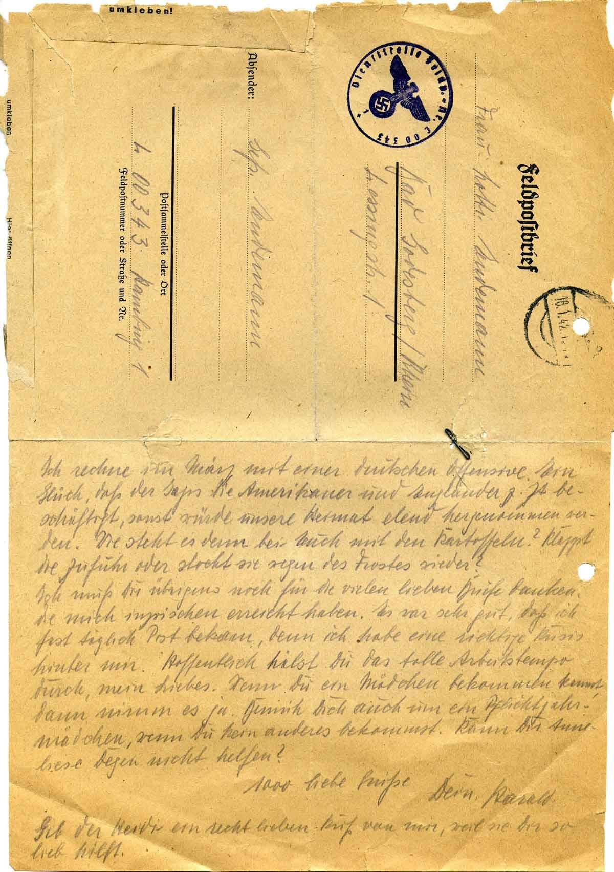 Ich rechne im März mit einer deutschen Offensive. Ein Glück, daß der Japs die Amerikaner und Engländer z.Z. beschäftigt, sonst würde unsere Heimat elend hergenommen werden. Wie steht es denn bei Euch mit den Kartoffeln? Klappt die Zufuhr oder stockt sie wegen des Frostes wieder?
