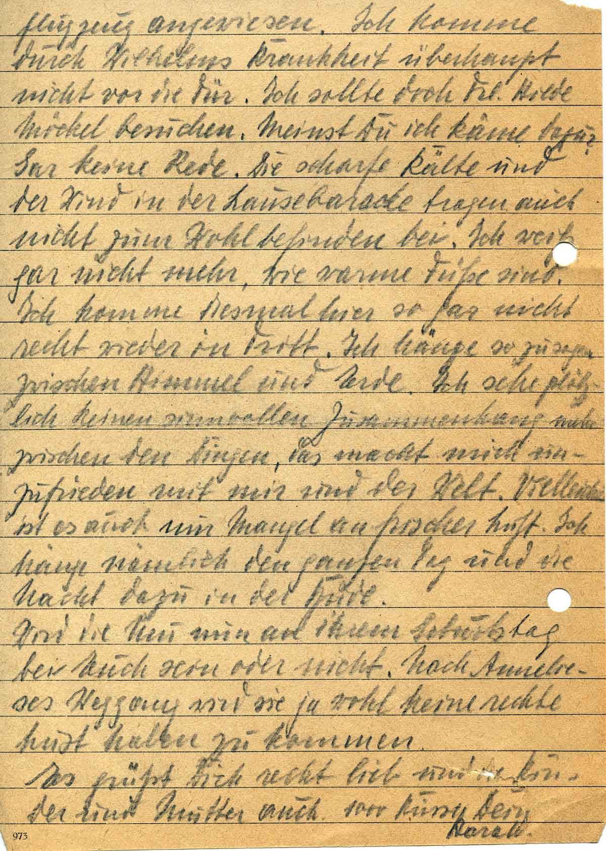 flugzeug angewiesen. Ich komme durch Wilhelms Krankheit überhaupt nicht vor die Tür. Ich sollte doch Frl. Hilde Möckel besuchen. Meinst Du ich ich käme dazu.Gar keine Rede. Ich weiß gar nicht mehr, wie warme Füße sind. Ich komme diesmal hier so gar nicht recht wieder in Tritt. Ich hänge sozusagen zwischen Himmel und Erde. Ich sehe plötzlich keinen sinnvollen Zusammenhang mehr zwischen den Dingen, das macht mich unzufrieden mit mir und der Welt. Vielleicht ist es auch nur Mangel an frischer Luft. Ich hänge nämlich den ganzen Tag und die Nacht dazu in der Bude.