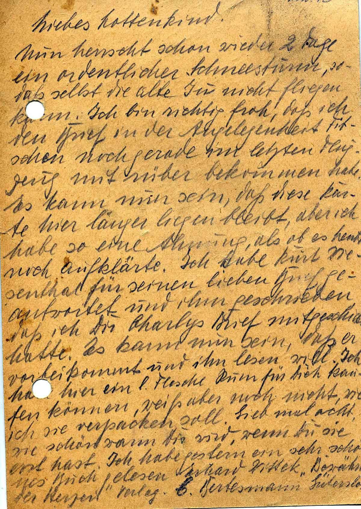 Nun herrscht schon wieder 2 Tage ein ordentlicher Schneesturm, sodaß selbst die alte Ju nicht fliegen kann. Ich bin richtig froh, daß ich den Brief in der Angelegenheit Fitschen noch gerade im letzten Flugzeug mit rüber bekommen habe. Es kann nun sein, daß diese Karte hier länger liegen bleibt, aber ich habe so eine Ahnung, als ob es heute noch aufklärte. Ich habe Kurt Wiesenthal für seinen lieben Brief geantwortet und ihm geschrieben daß ich Dir Charlys Brief mitgeschickt hatte. Es kann nun sein, daß er vorbeikommt und ihn lesen will. Ich habe hier ein l. Rum für dich kaufen können, weiß aber noch nicht, wie ich sie verpacken soll. Gieb mal klein acht, wie schön warm dir wird, wenn du sie erst hat hast. Ich habe gestern ein sehr schönes Buch gelesen Ehrhard Wittek „Bewähr(ung) der Herzen“ Verlag. G. Berte(l)smann Gütersloh