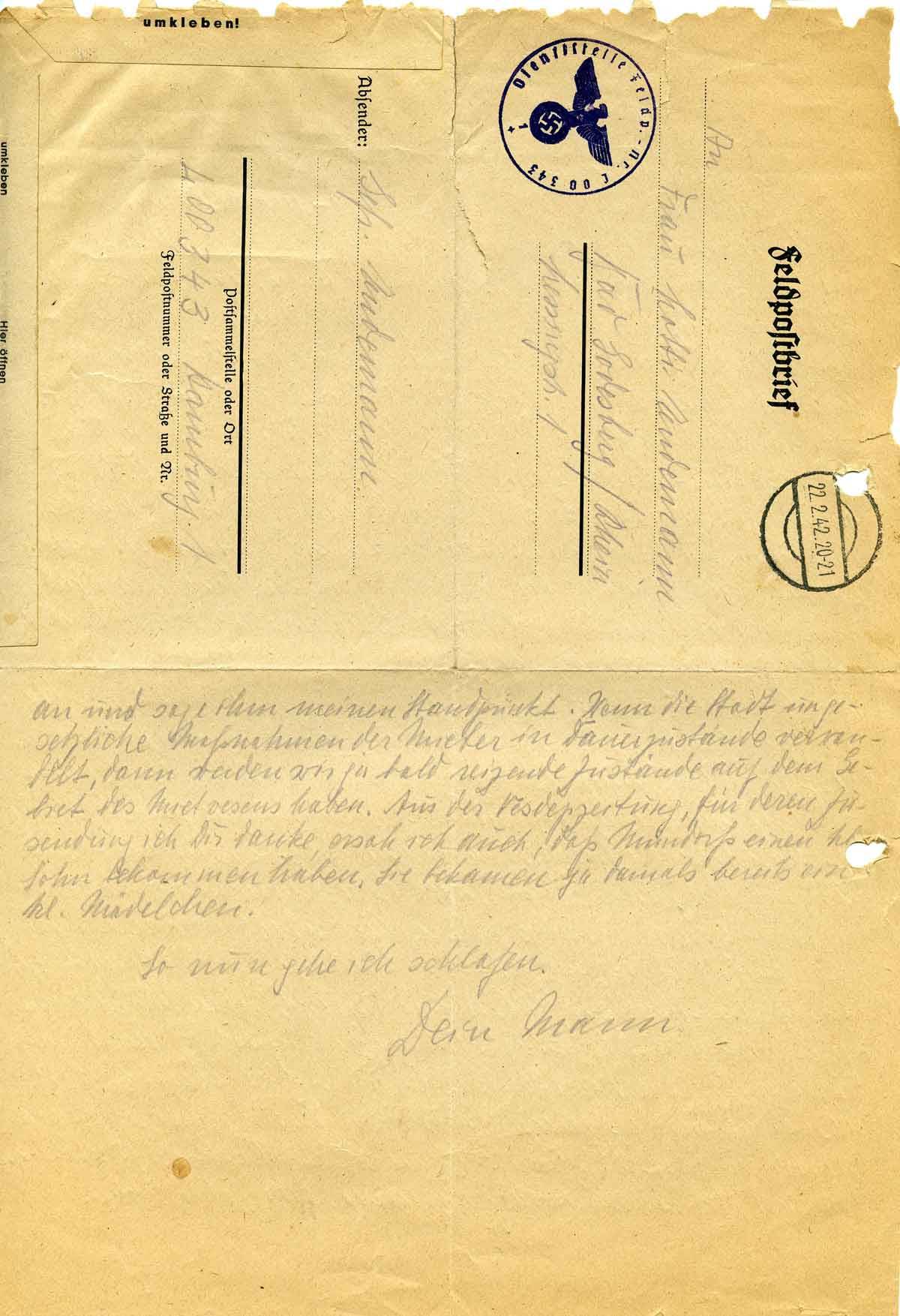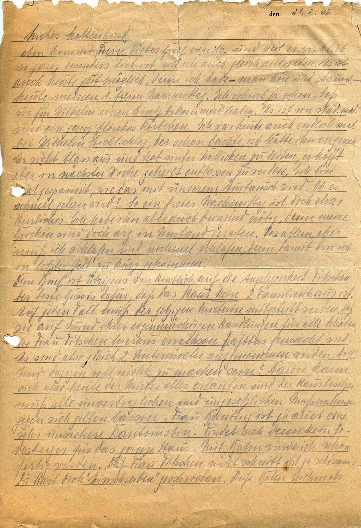 Harald Endemann an seine Frau Charlotte, 21. Februar 1942