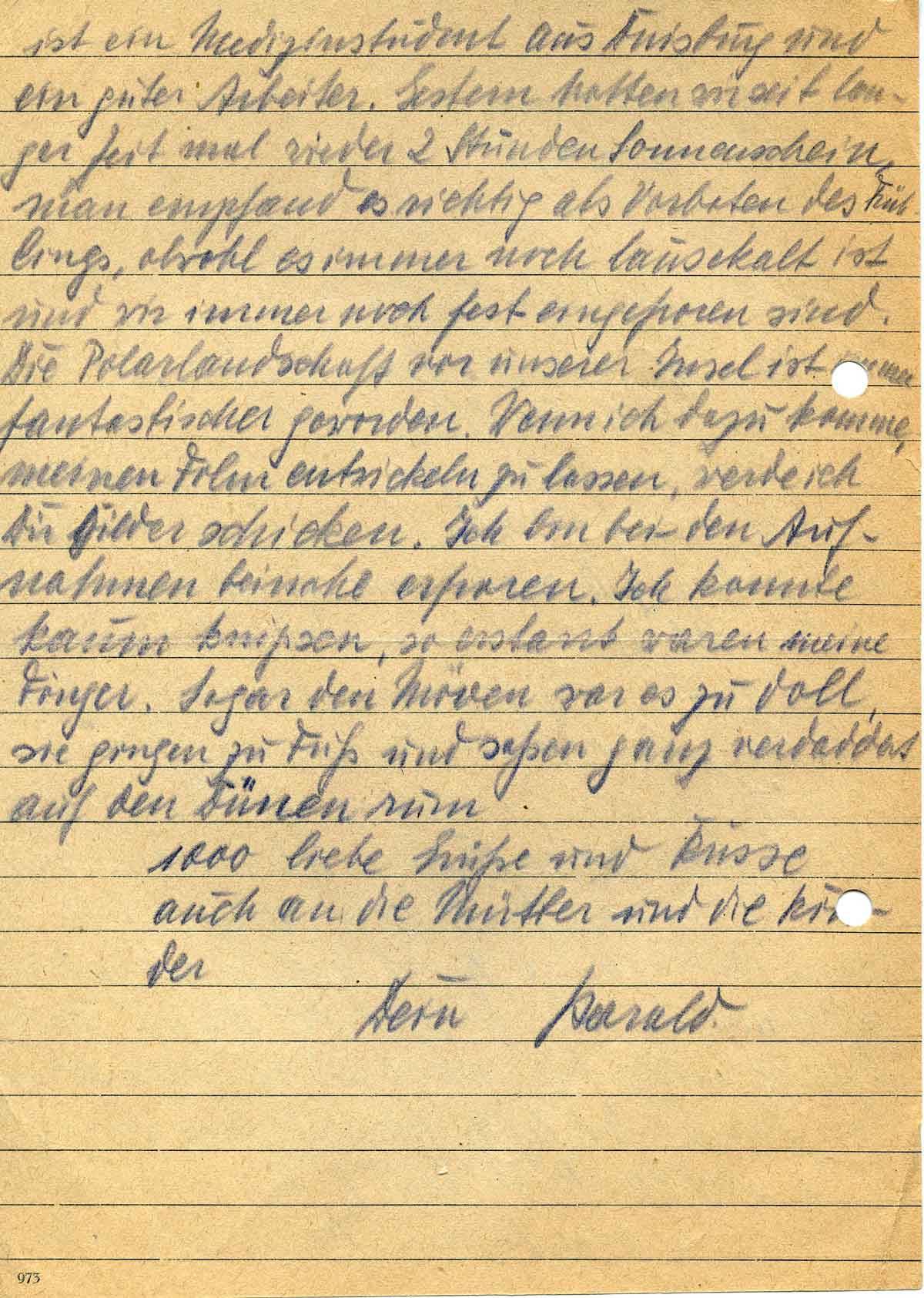ist ein Medizinstudent aus Duisburg und ein guter Arbeiter. Gestern hatten wir seit langer Zeit wieder mal 2 Stunden Sonnenschein, man empfand es richtig als Vorboten des Frühlings, obwohl es immer noch lausekalt ist und wir immer noch fest eingefroren sind. Die Polarlandschaft vor unserer Insel ist immer fantastischer geworden. Wenn ich dazu komme, meinen Film entwickeln zu lassen, werde ich Dir Bilder schicken. Ich bin bei den Aufnahmen beinahe erfroren. Ich konnte kaum knipsen, so erstarrt waren meine Finger. Sogar den Möven war es zu doll, sie gingen zu Fuß und saßen ganz verdaddert auf den Dünen rum.