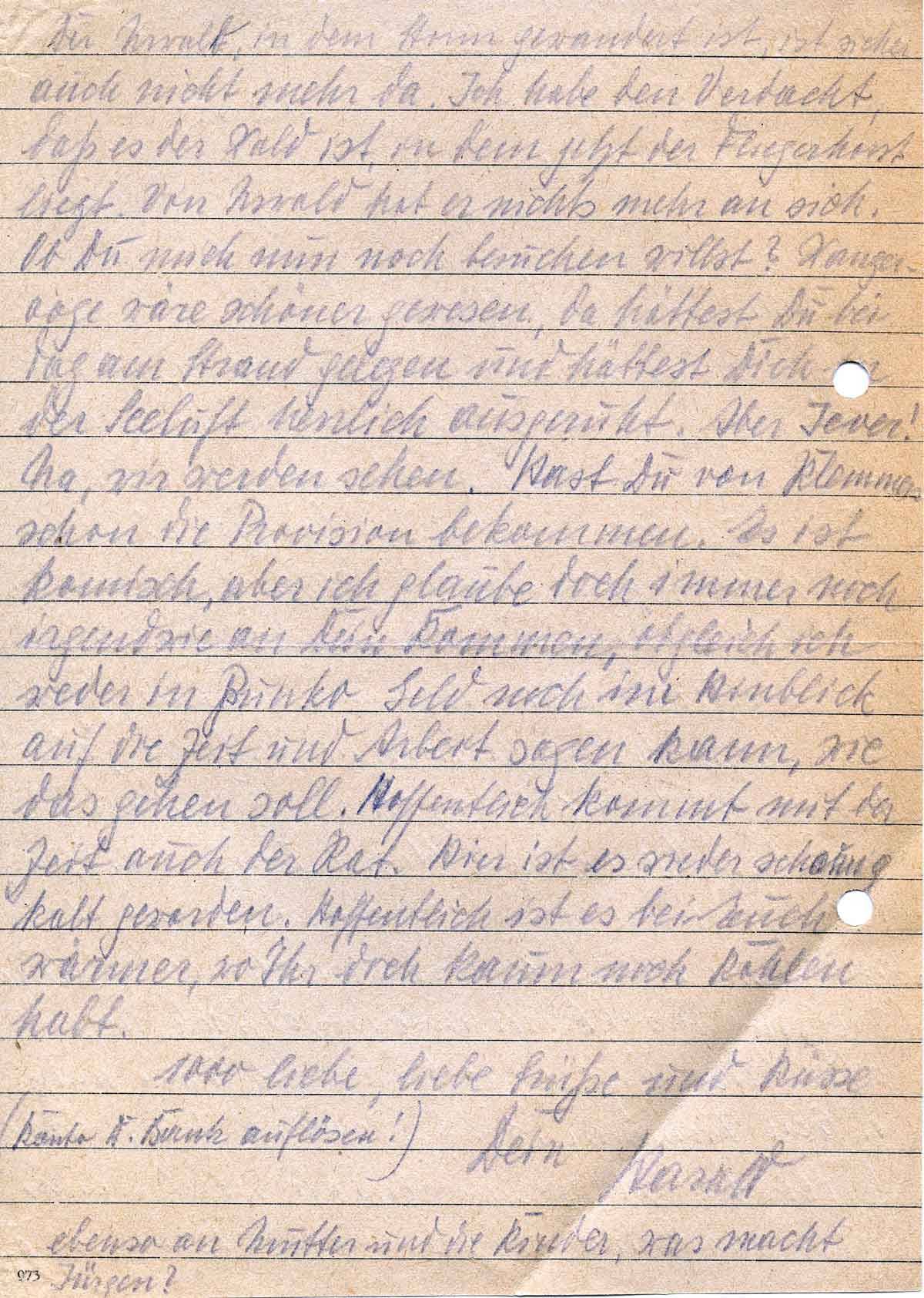 Der Urwald, in dem Storm gewandert ist, ist sicher auch nicht mehr da. Ich habe den Verdacht, daß es der Wald ist, indem jetzt der Fliegerhorst liegt. Von Urwald hat er nichts mehr an sich. Ob Du mich nun noch besuchen willst? Wangerooge wäre schöner gewesen, da hättest Du bei Tag am Strand gelegen und hättest Dich in der Seeluft herrlich ausgeruht. Aber Jever! Na, wir werden sehen. Hast Du von Klemmers schon die Provision bekommen. Es ist komisch, aber ich glaube doch immer noch irgendwie an Dein kommen, obgleich ich weder in Punk(t)o Geld noch im Hinblick auf die Zeit und Arbeit sagen kann, wie das gehen soll. Hoffentlich kommt mit der Zeit auch der Rat. Hier ist es wieder schön kalt geworden. Hoffentlich ist es bei Euch wärmer wo Ihr kaum noch Kohlen habt.