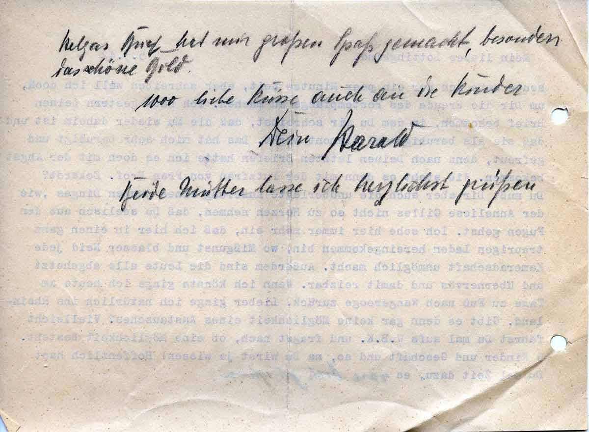 Du mußt Dir aber auch die unüberlegte Äußerung eines jungen Dinges, wie der Anneliese Gilles nicht so zu Herzen nehmen, daß Du seelisch aus den Fugen gehst. Ich sehe hier immer mehr ein, daß ich hier in einen ganz traurigen Laden herein gekommen bin, wo Mißgunst und blasser Neid jede Kameradschaft unmöglich macht. Außerdem sind die Leute alle abgehetzt und übernervös und damit reizbar. Wenn ich könnte ginge ich heute am Tage zu Fuß nach Wangerooge zurück. Lieber ginge ich natürlich ins Rheinland. Gibt es denn gar keine Möglichkeit eines Austausches? Vielleicht fährst Du mal aufs W.B.K. und fragst nach, ob eine Möglichkeit besteht. 5 Kinder und Geschäft und so, na Du wirst ja wissen! Hoffentlich hast Du mal Zeit dazu, es wäre doch zu schön.