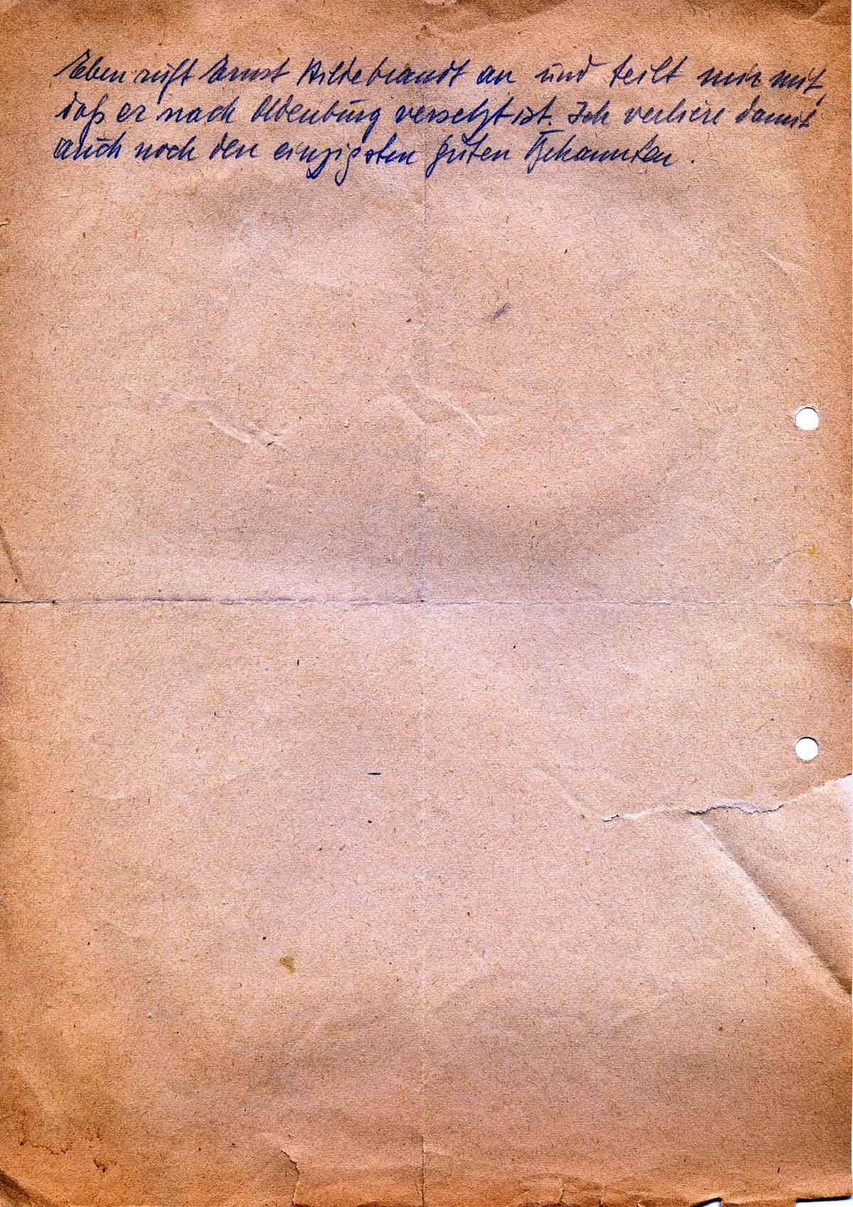 Ich bat Dich, mir doch ein Paket zu schicken. Es darf aber nicht, wie ich heute erfahre nach Jever gehen, sondern muss nach Upjever über Jever gehen. Postlagernd natürlich. Ein paar Zigaretten kannst Du wohl nicht einlegen. Hier in J. gibt es nur 3 Stück pro Tag.